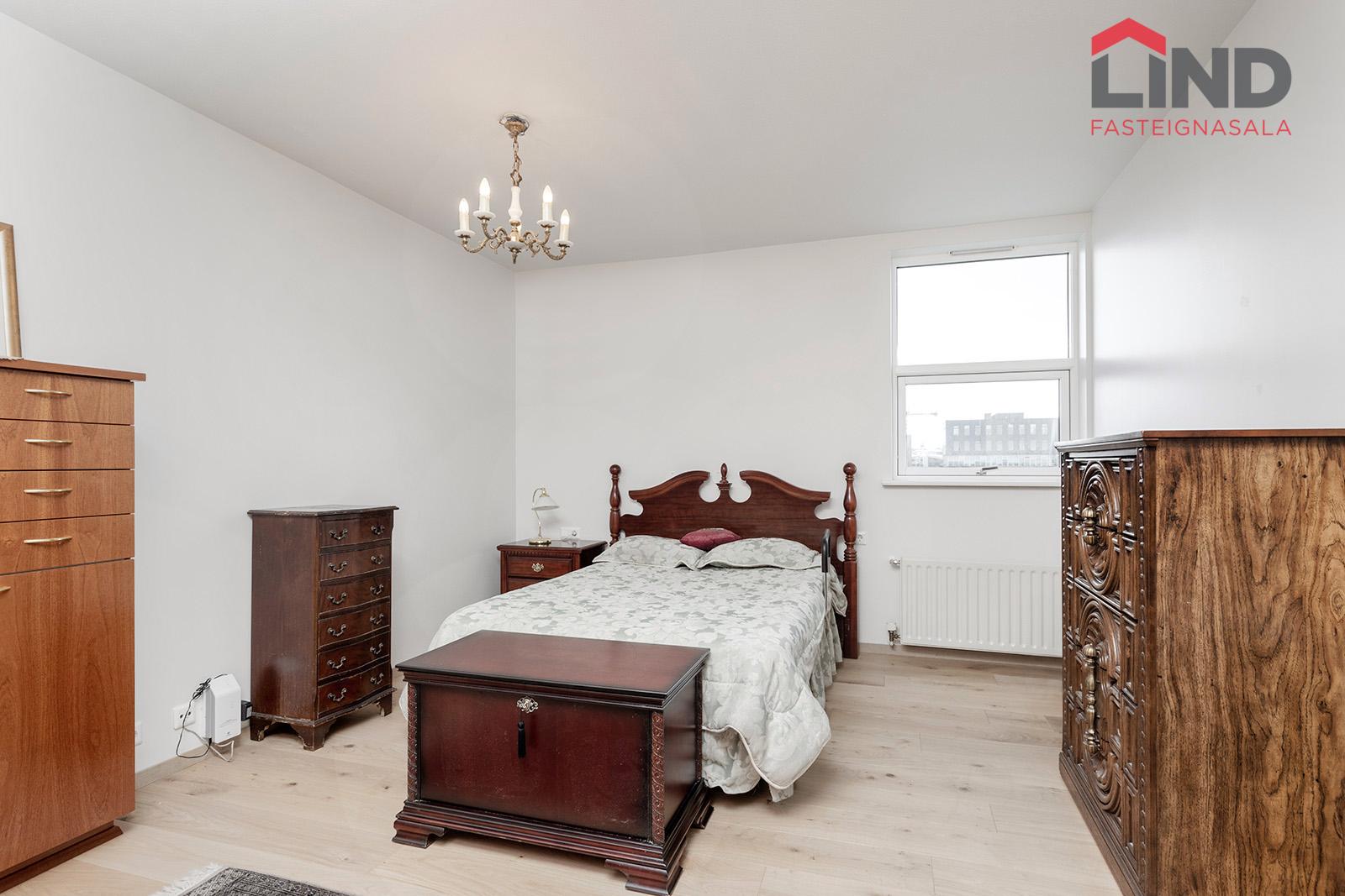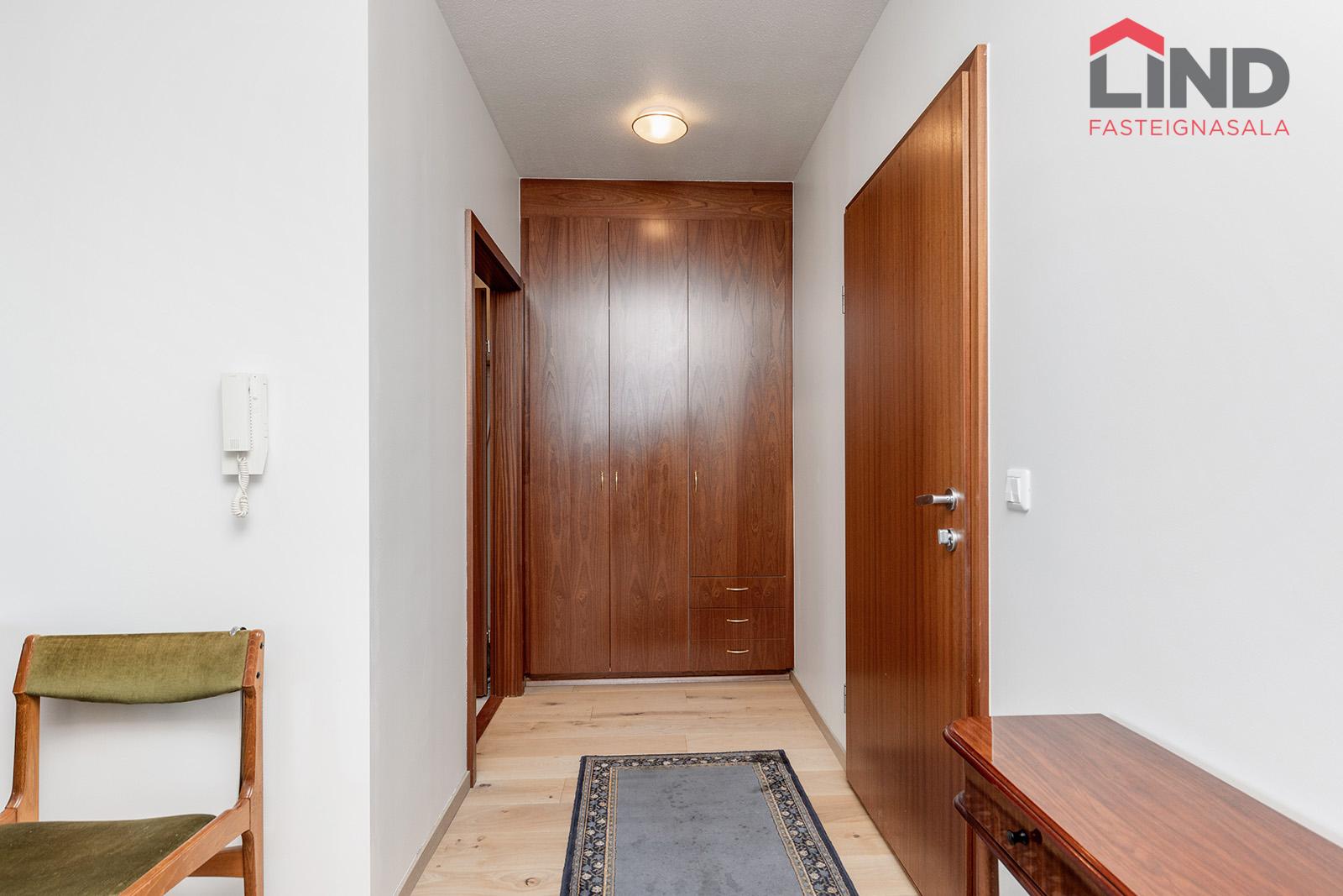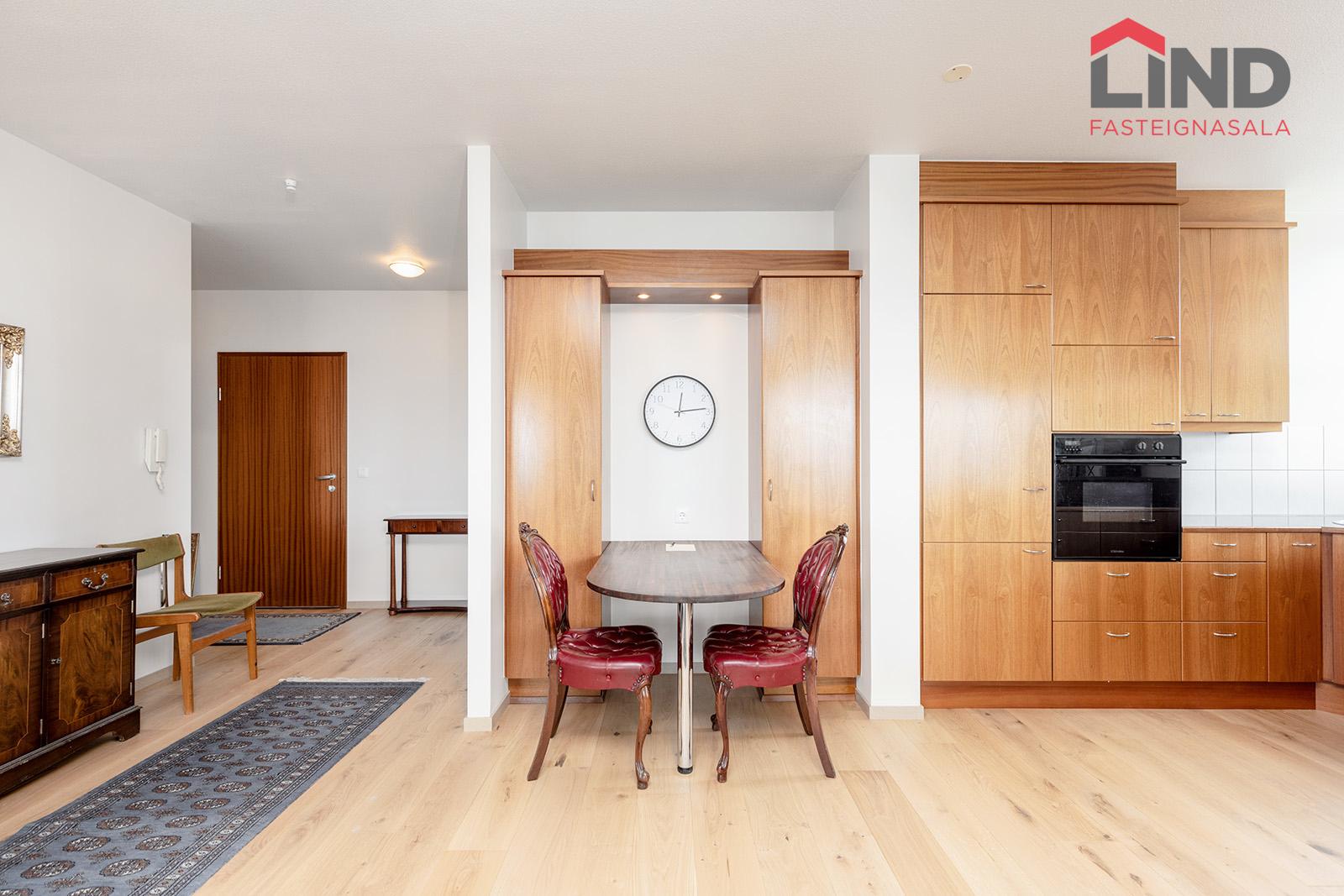 Nánari lýsing. Komið er inní anddyri með fataskáp, inn af því er gengið inná bjart alrými. Stórt hjónaherbergi með rúmgóðum fataskápum. Baðherbergi er rúmgott með fallegri innréttingu, klósetti, baðkari með sturtuaðstöðu. Þvottaherbergi er sameiginlegt á hæðinni, hver með sína vél. Eldhús er með fallegum innréttingum. Úr stofu er útgengt á yfirbyggðar svalir með hita.