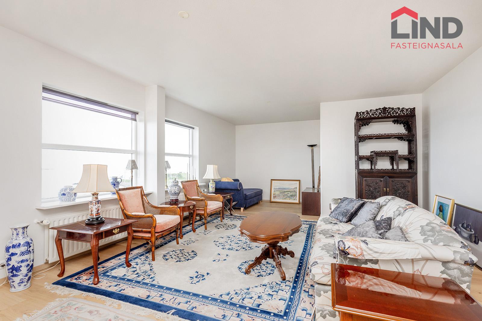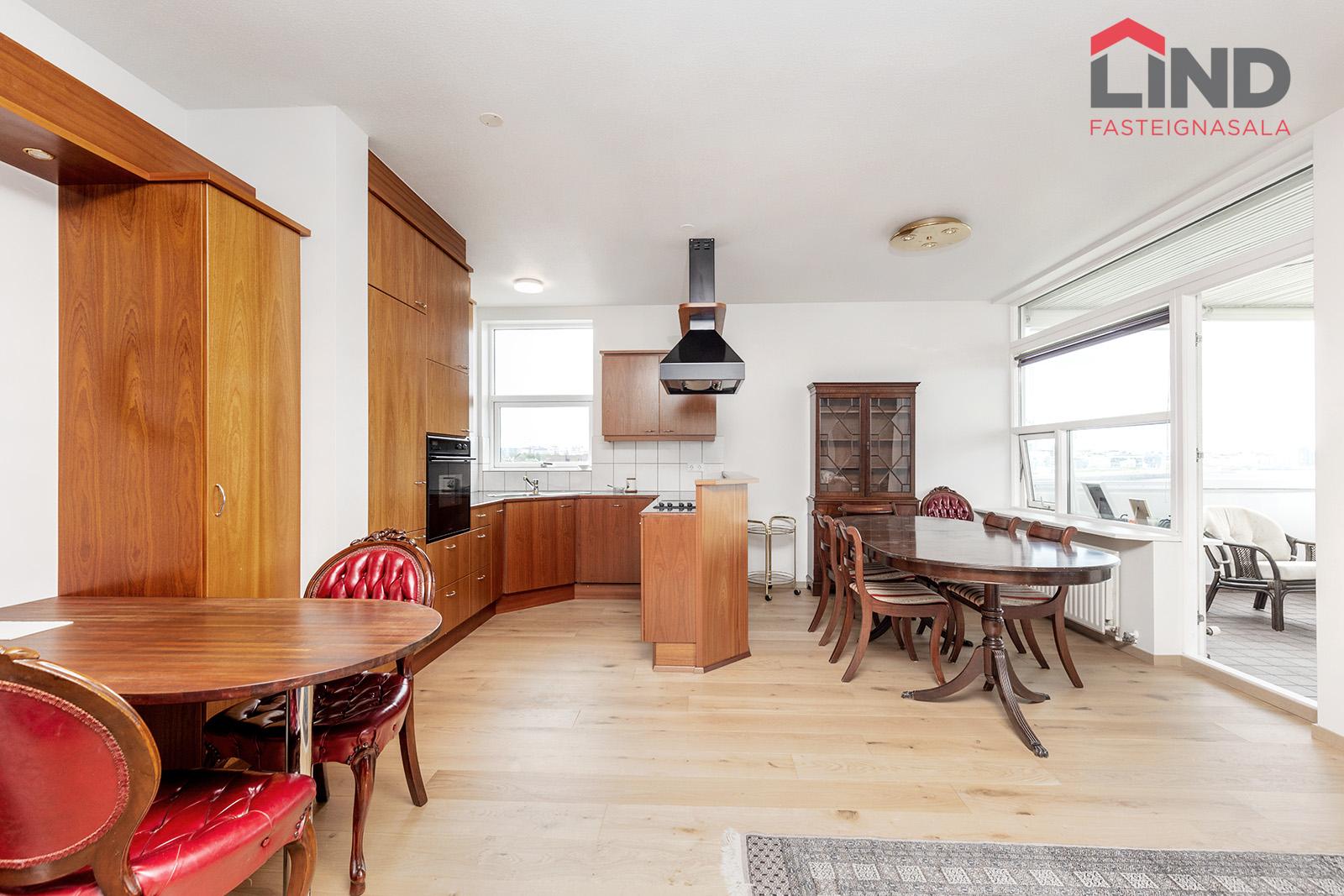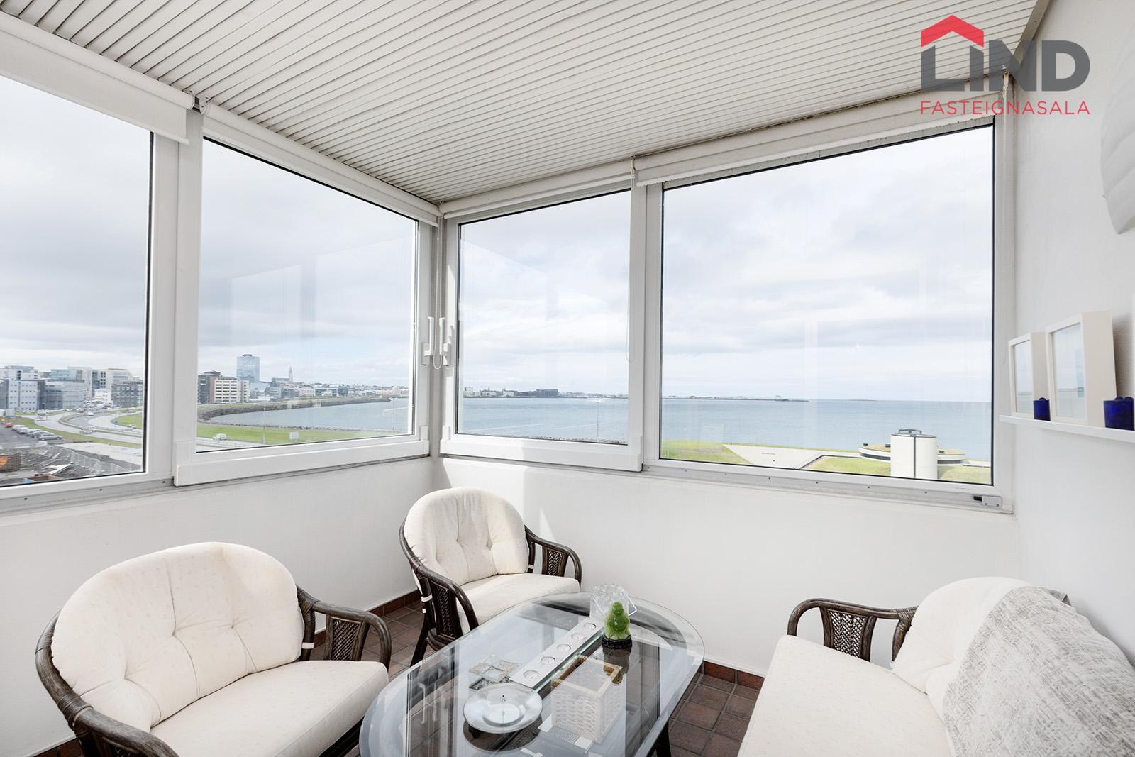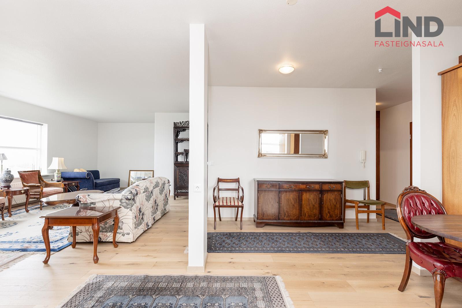 Albert Bjarni og Lind fasteignasala kynnir: Afar vel staðsetta 2ja herbergja 106 fm útsýniseign á 5 hæð til leigu til skamms eða allt að eins árs í lyftuhúsi að Kirkjusandi 1, afar eftirsótt staðsetning með Borgartúnið, Laugardalinn og miðbæinn í næsta nágrenni. Eigninni fylgir stæði í bílageymslu og góðum svölum með afar fallegu útsýni. Íbúðin er með fallegum innréttingum, flísalagt í baðherbergi og parketlögðum gólfum. Hægt að flytja beint inn, allt til alls, húsbúnaður og tæki. Geymsla fylgir ekki. Innifalið í leigu er hússjóðsgjald þ.m.t. allur hitakostnaður.
