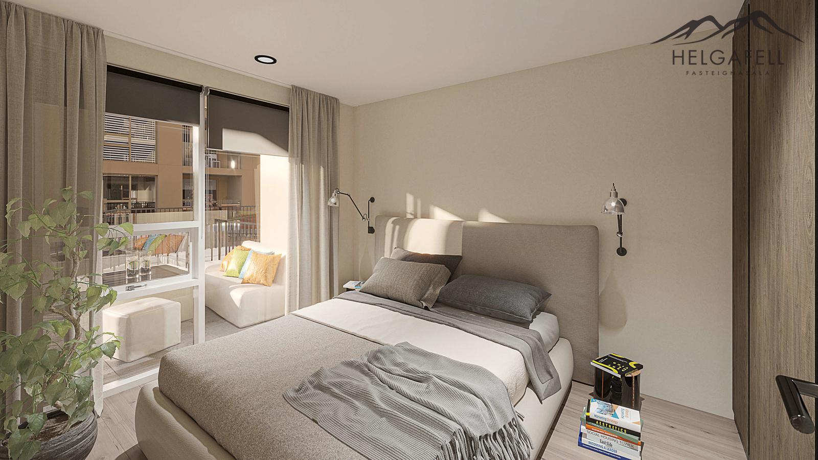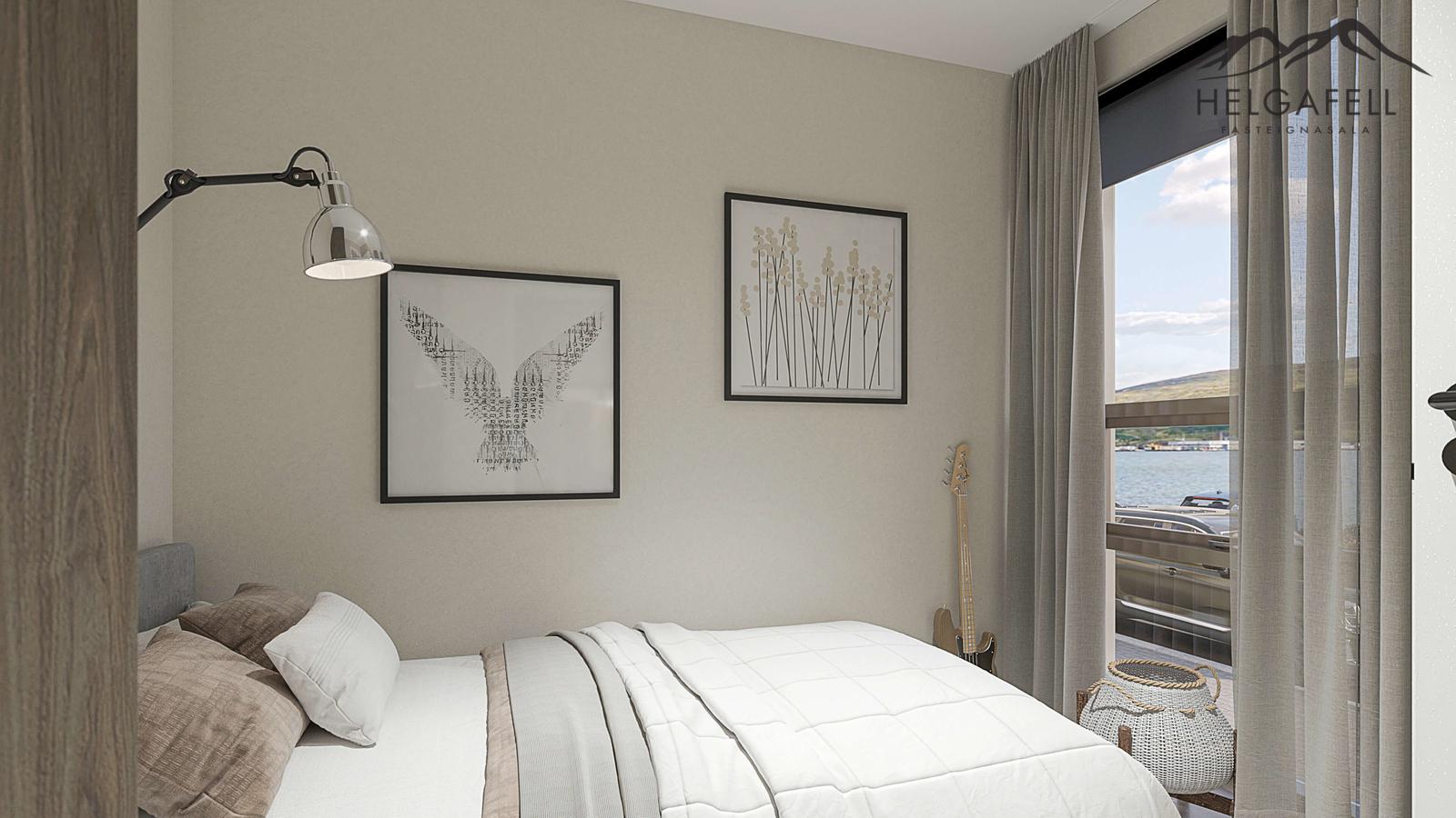 Hjónaherbergi er rúmgott 13,5fm. með góðum skáp. Útgengt á svalir til norðurs með útsýni út á pollinn.