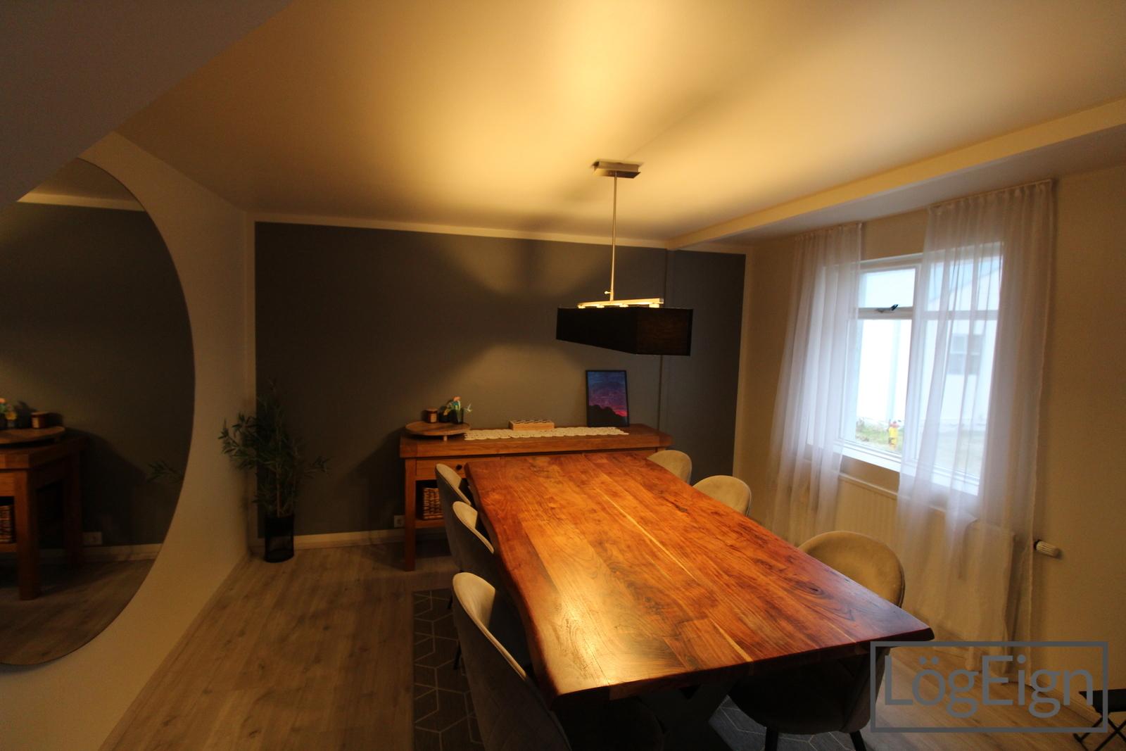 Borðstofa: Inn af holi er parketlögð borðstofa, eldhús og borðstofan eru í opnu rými.
