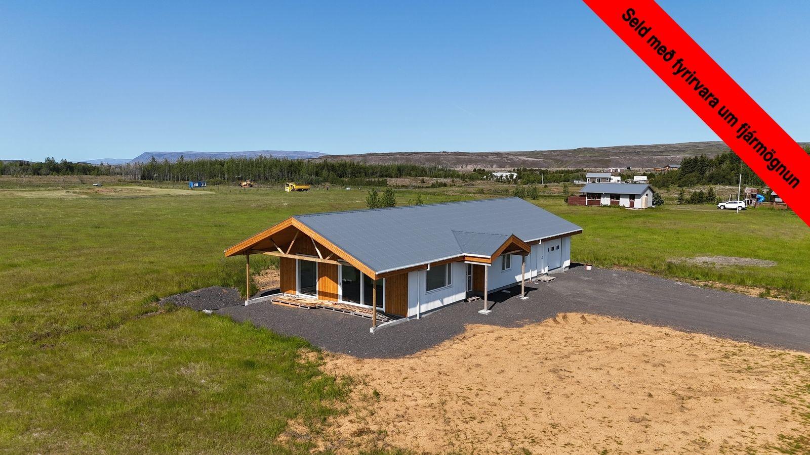 Nánari lýsing: Húsið er timburhús klætt með standandi málmklæðningu og timburklæðningu. Bárujárn á þaki. Eldvarnarveggur milli íbúðar og bílskúrs er steyptur. Útihurðar eru frá Rational og gluggar eru áltré. Húsið skilast fullbúið að utan. Lífræn skolphreinsistöð er frágengin og tengd. Lóðin er gróin og möl í innkeyrslu. Vantar yfirborðsfrágang á moldarflag framan við hús.