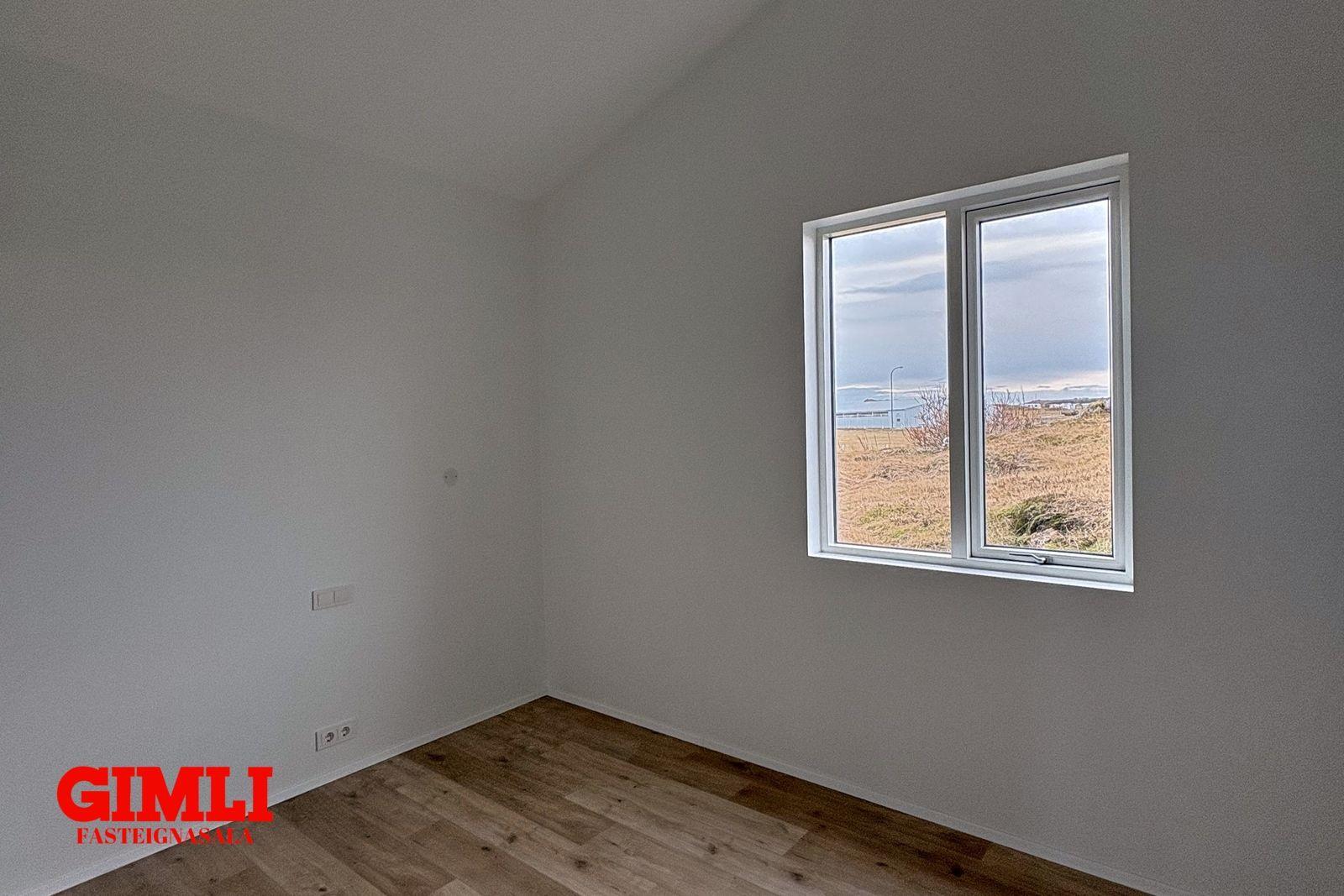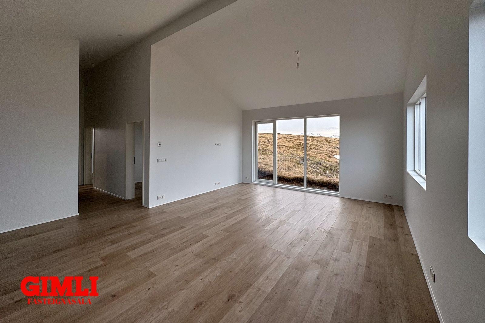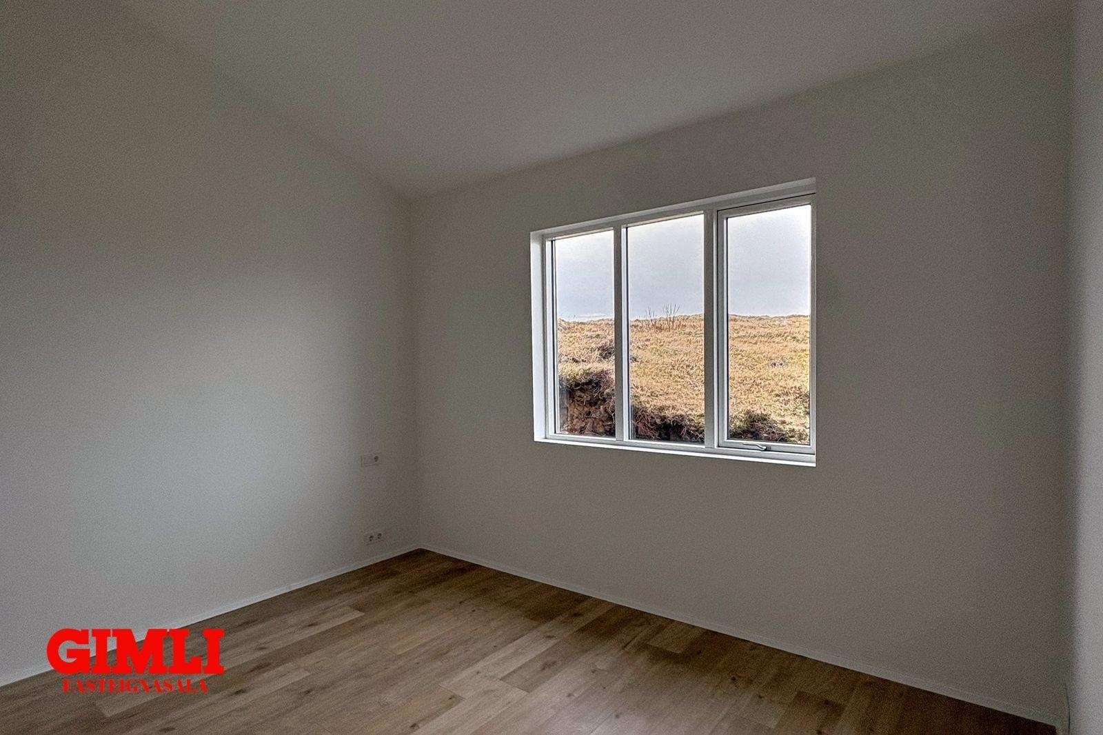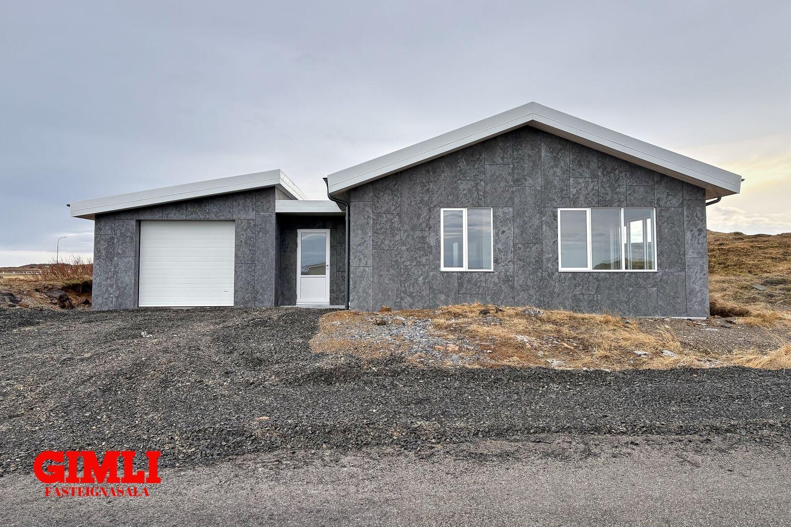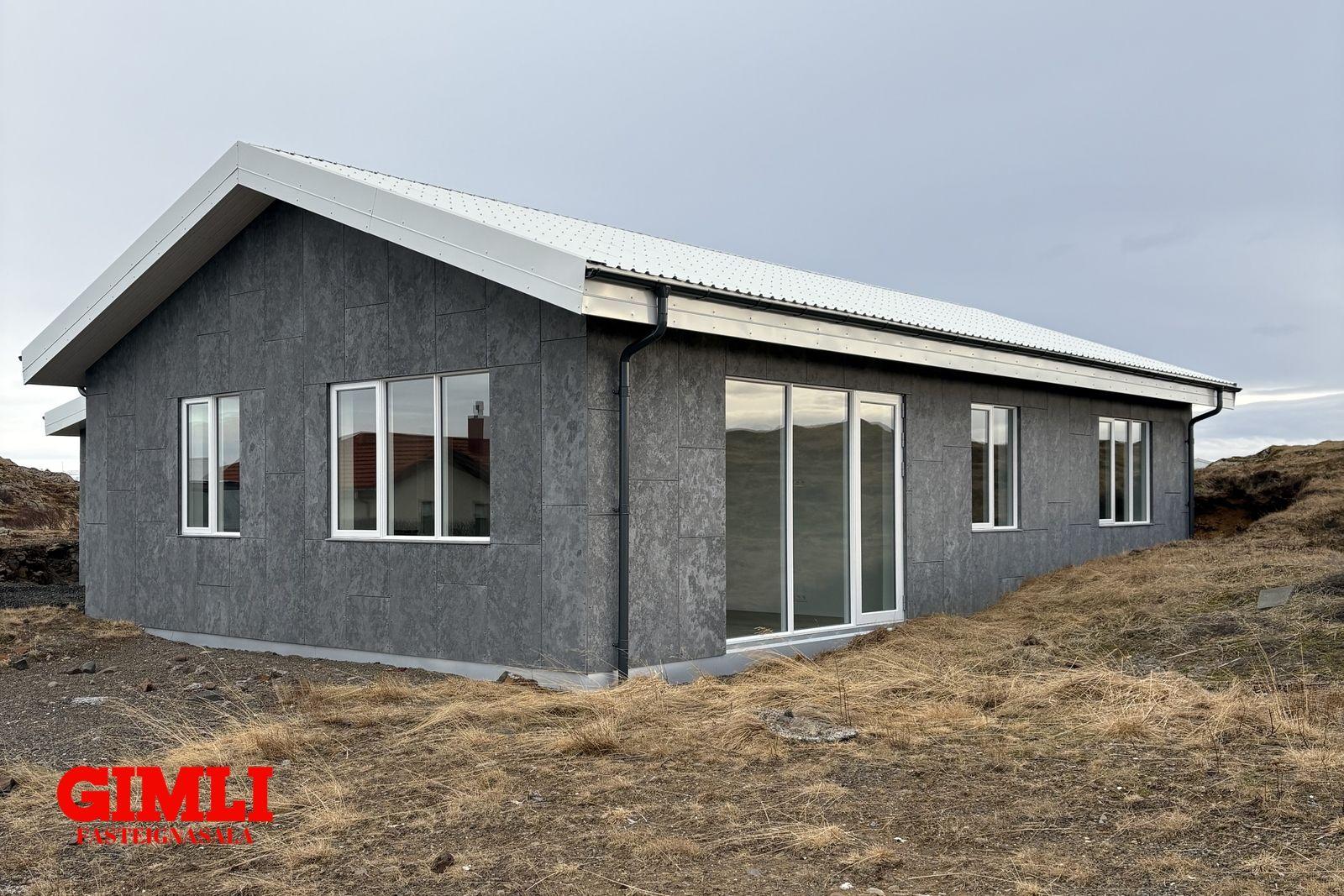 Eignin er fullfrágengin á byggingarstigi 4, matsstigi 7 og getur afhenst við kaupsamning.Nánri upplýsingar veitir Guðmunda Björnsdóttir Stackhouse í síma 7927576, eða gudmunda@gimli.isNÁNARI LÝSING:Húsið er reist með SIP einingum, sem eru sterkbyggðar og vel einangraðar samlokueiningar, samsettar úr OSB plötum og pólýstýren. Innra byrði veggja er klætt tveggja tommu rafmagnsgrind, tveggja tommu ull, 12 mm krossviði og 12 mm gifsi. Loft eru klædd með einföldu gifslagi, en veggir með tvöföldu. Að utan er húsið klætt með gráum fiber cement panel frá Struktúr.