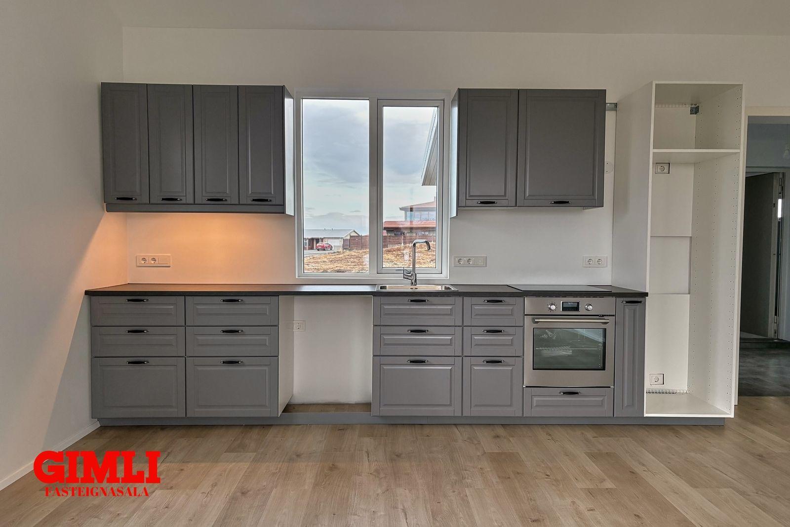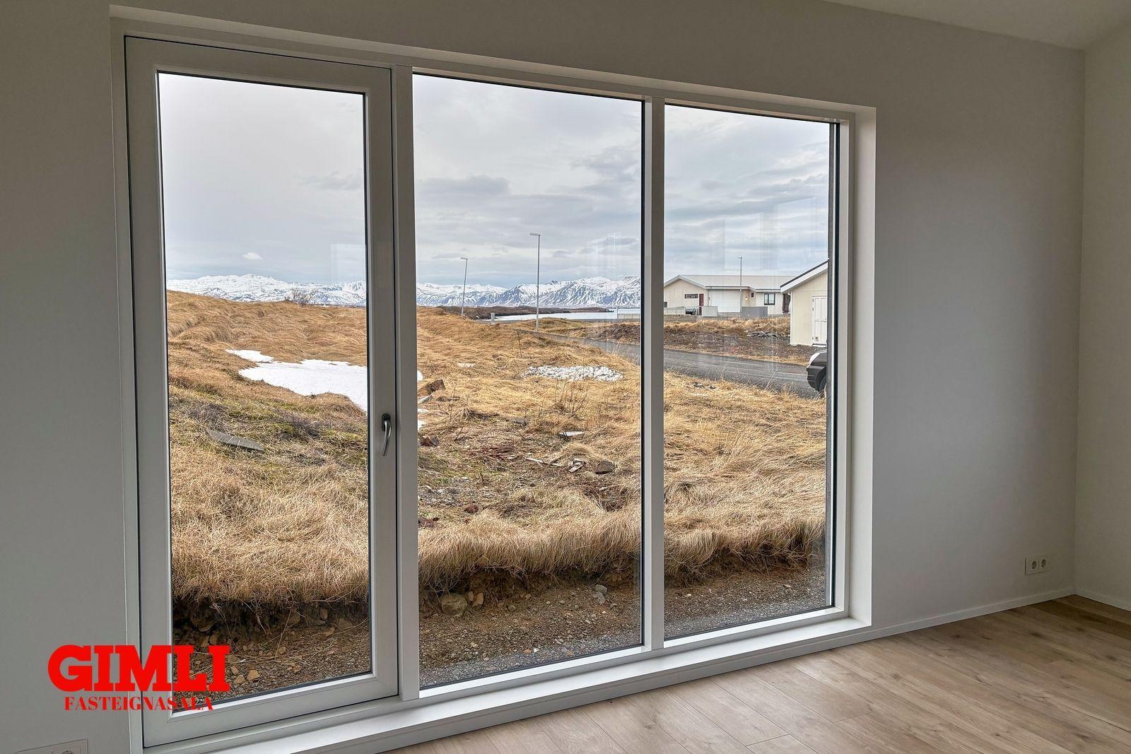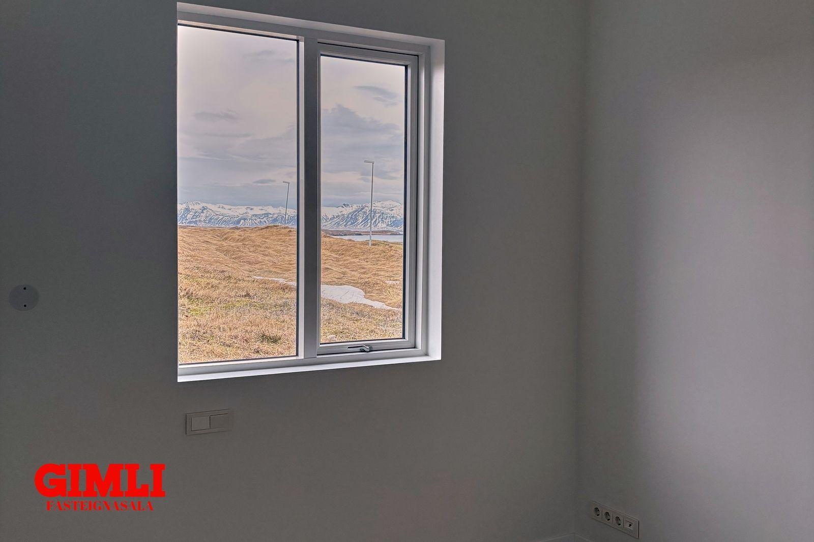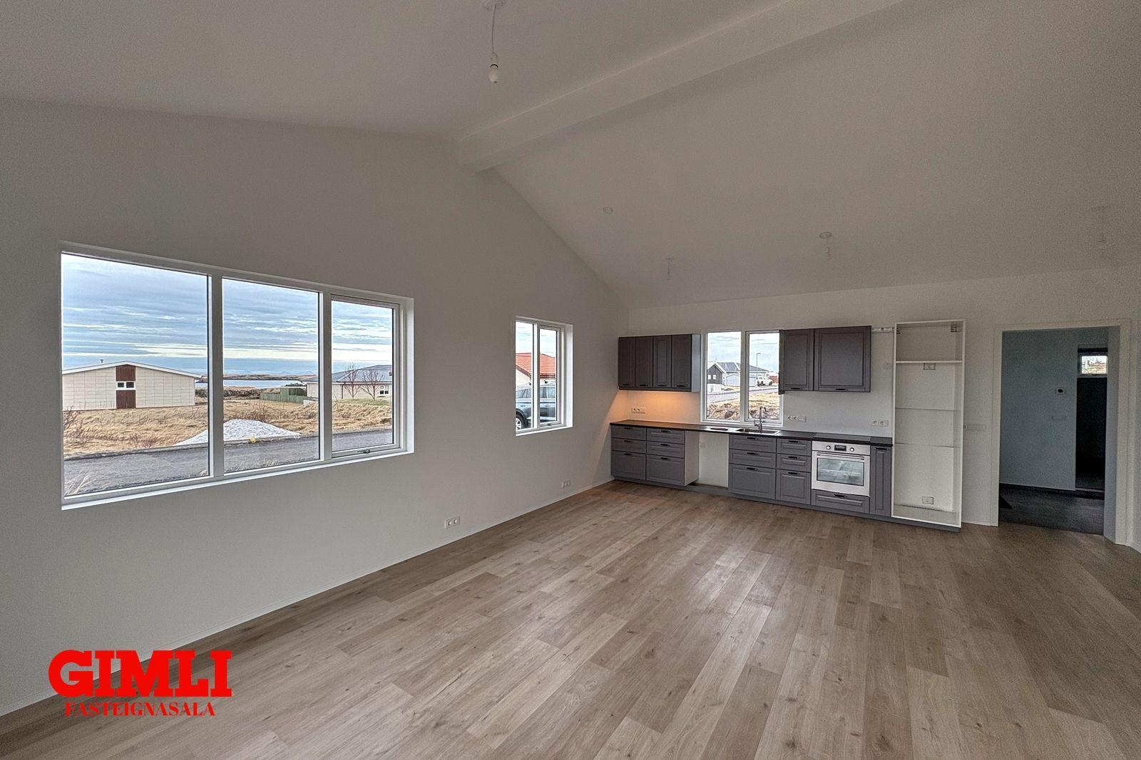Eignin er fullfrágengin á byggingarstigi 4, matsstigi 7 og getur afhenst við kaupsamning.Nánri upplýsingar veitir Guðmunda Björnsdóttir Stackhouse í síma 7927576, eða gudmunda@gimli.isNÁNARI LÝSING:Húsið er reist með SIP einingum, sem eru sterkbyggðar og vel einangraðar samlokueiningar, samsettar úr OSB plötum og pólýstýren. Innra byrði veggja er klætt tveggja tommu rafmagnsgrind, tveggja tommu ull, 12 mm krossviði og 12 mm gifsi. Loft eru klædd með einföldu gifslagi, en veggir með tvöföldu. Að utan er húsið klætt með gráum fiber cement panel frá Struktúr.