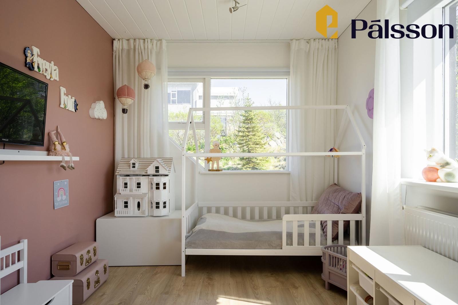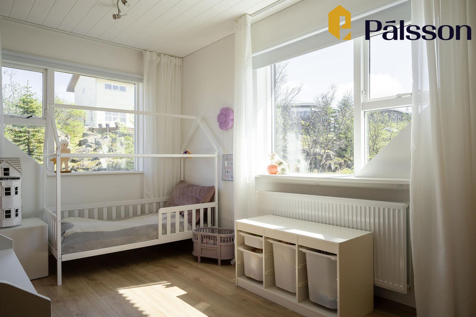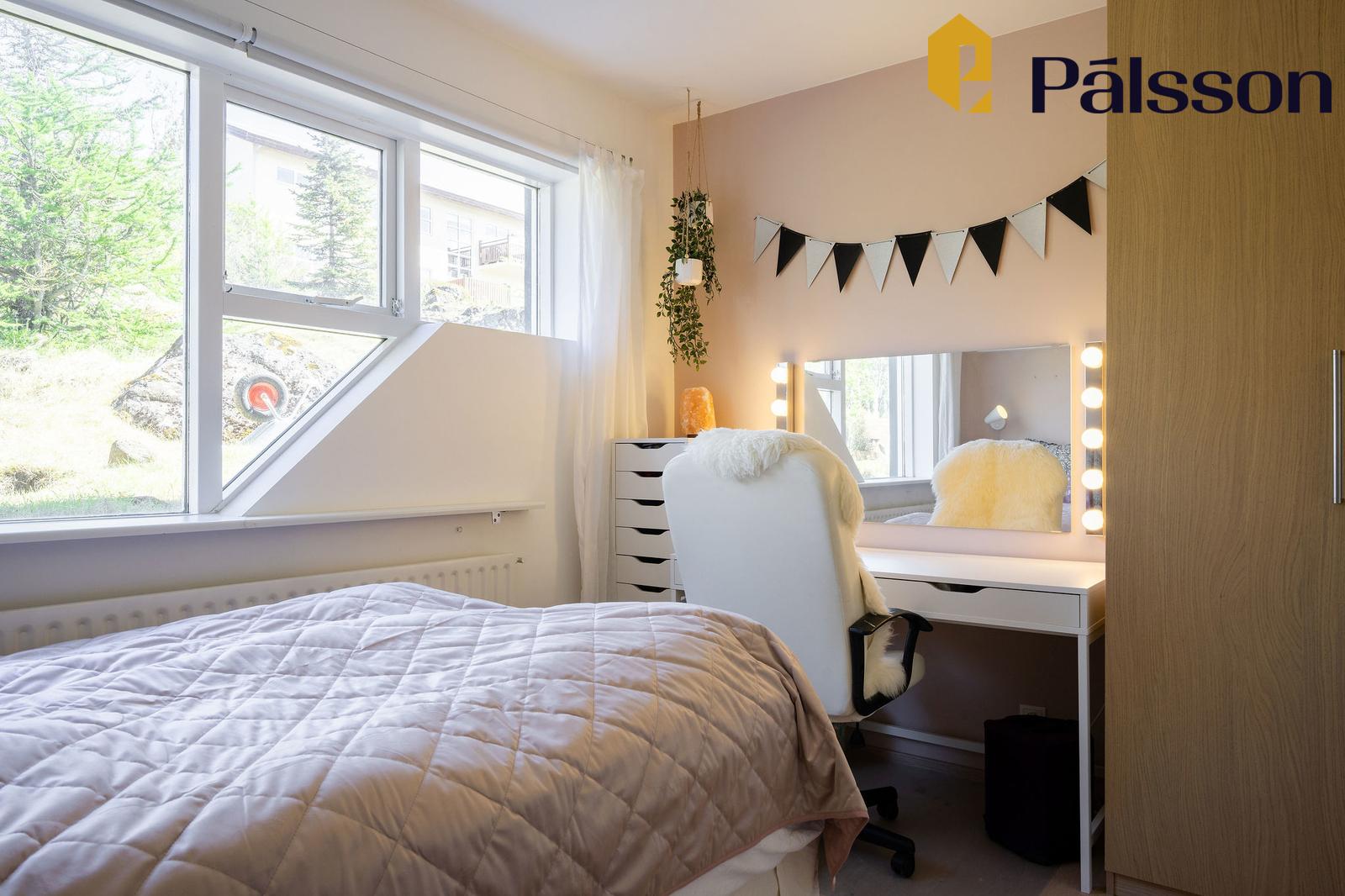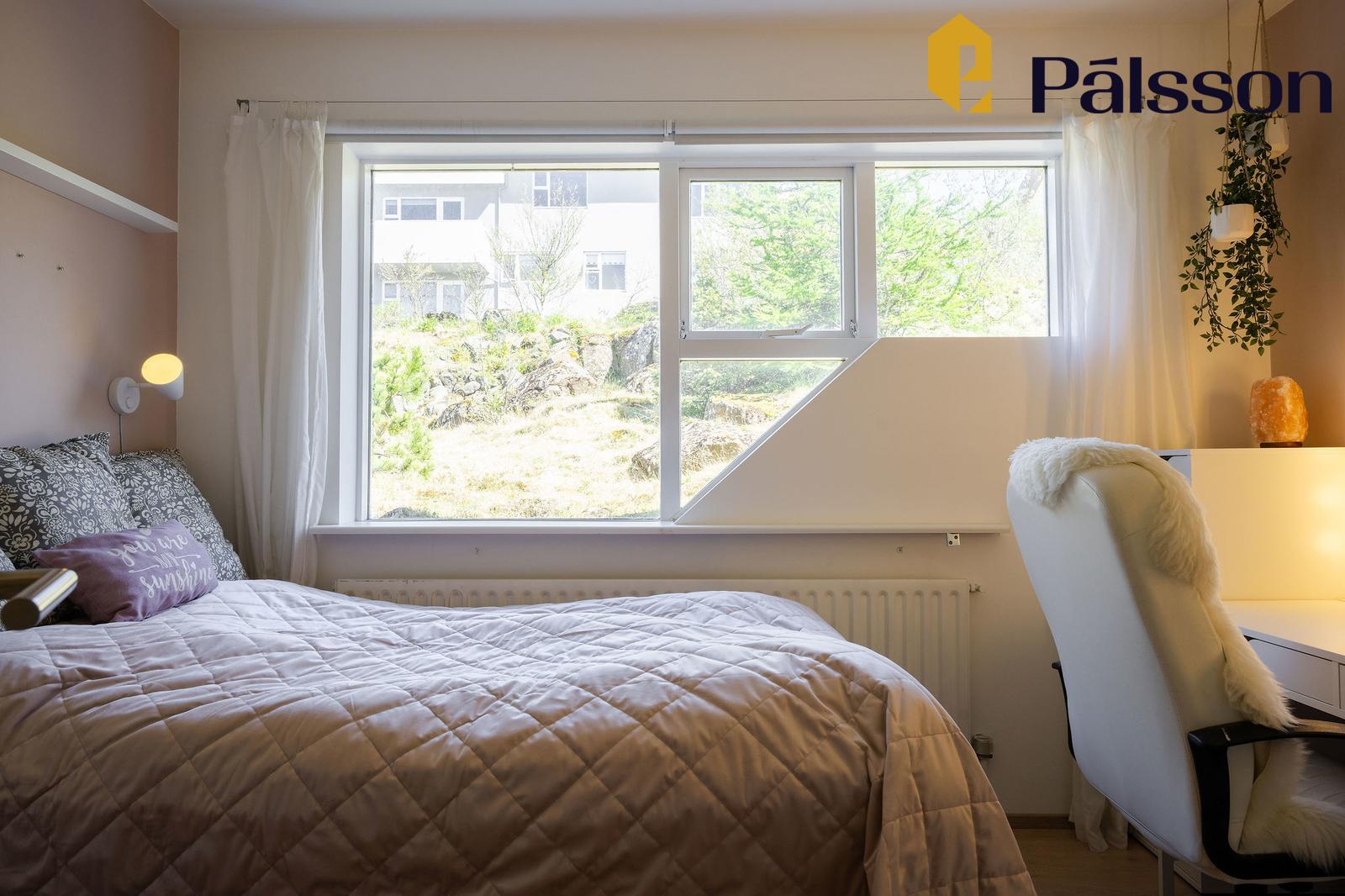 Svefnherbergi II er rúmgott með fataskáp og gluggum á tvo vegu. Parket á gólfum