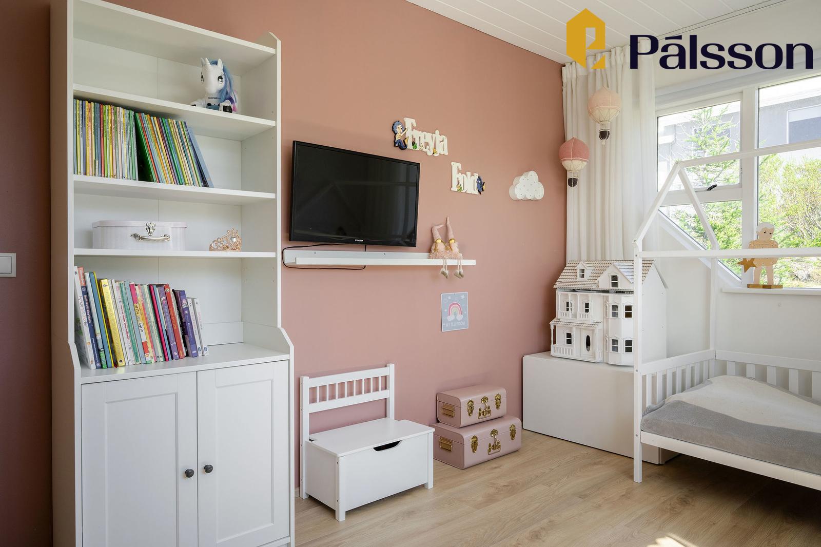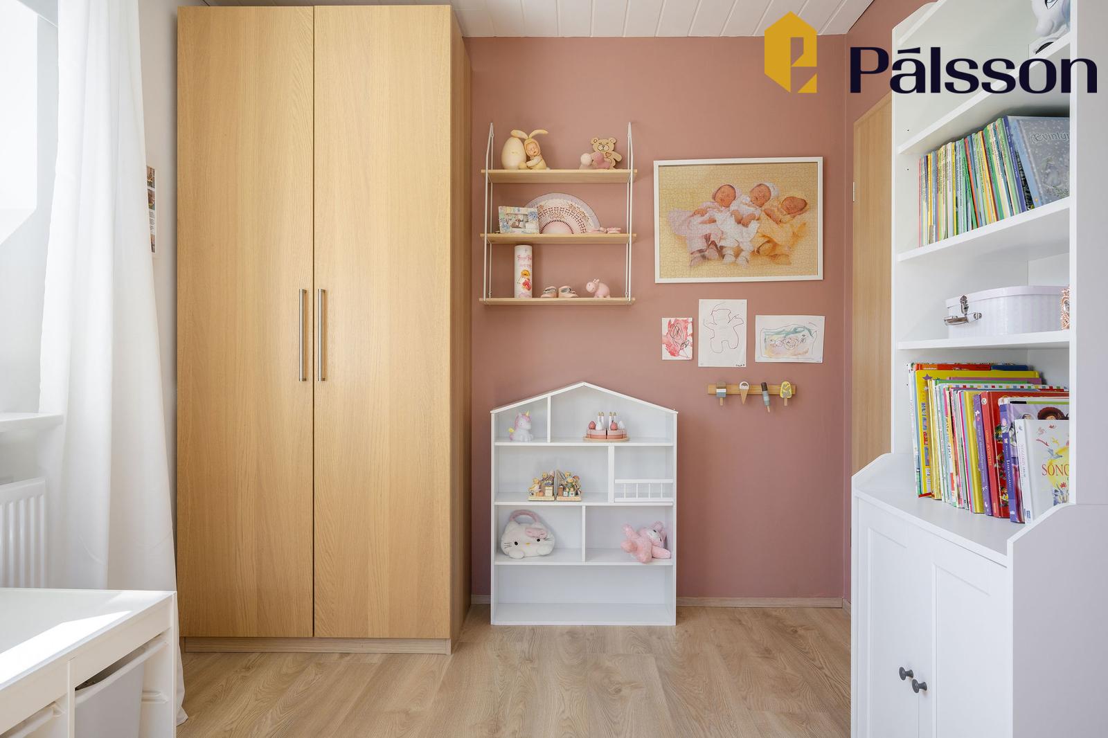 Svefnherbergi I er rúmgott með góðum fataskáp. Geymsluloft. Parket á gólfum