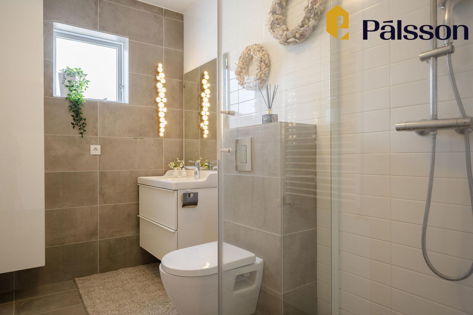 Baðherbergi II er nýlegt uppgert, flísar í hólf og gólf, hvít innrétting með hvítri handlaug, vegghengt klósett, sturtuklefi og handklæðaofn.