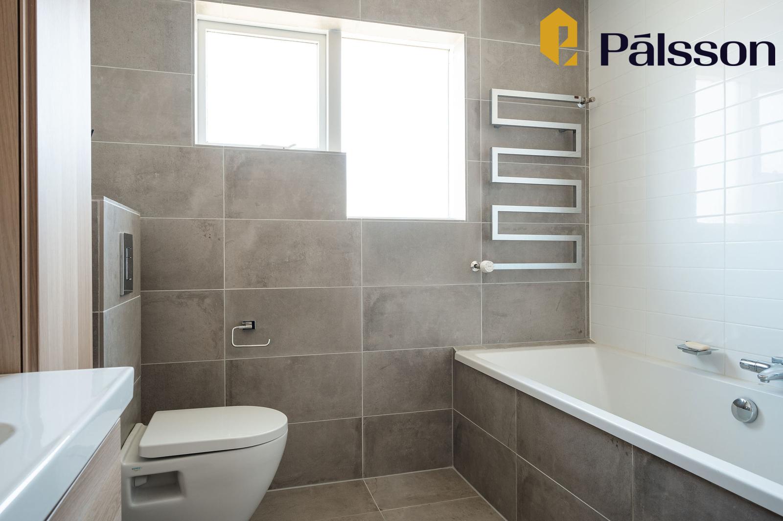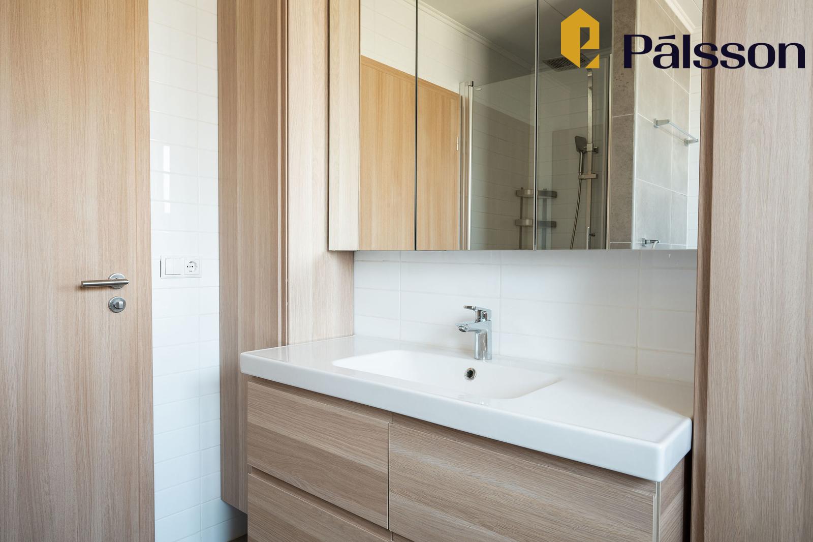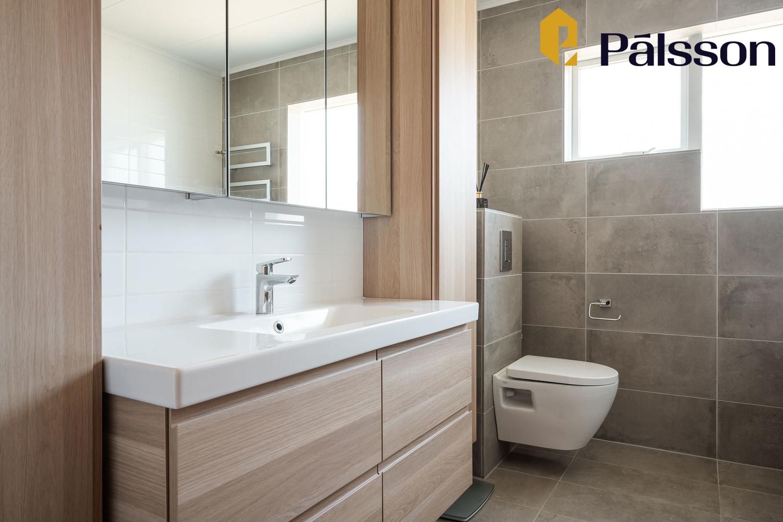 Baðherbergi I er nýlega uppgert, flísar í hólf og gólf, vegghengt klósett, baðkar, fallegur handklæðaofn, sturta með vönduðum tækjum, hvít handlaug, góð viðarinnrétting með góðu skápaplássi og speglaskápum.