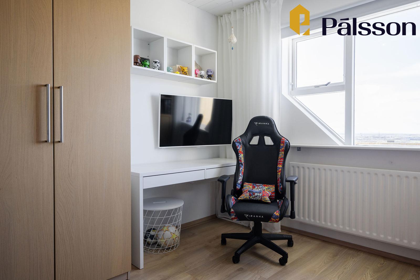 Svefnherbergi VI er rúmgott með fataskáp og hornglugga. Parket á gólfum.