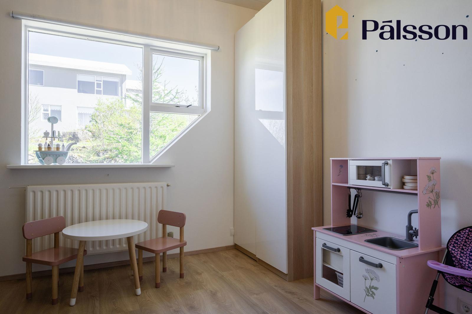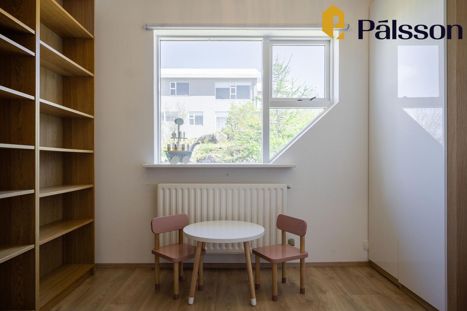 Svefnherbergi V er rúmgott með góðum glugga og fataskáp. Parket á gólfum.