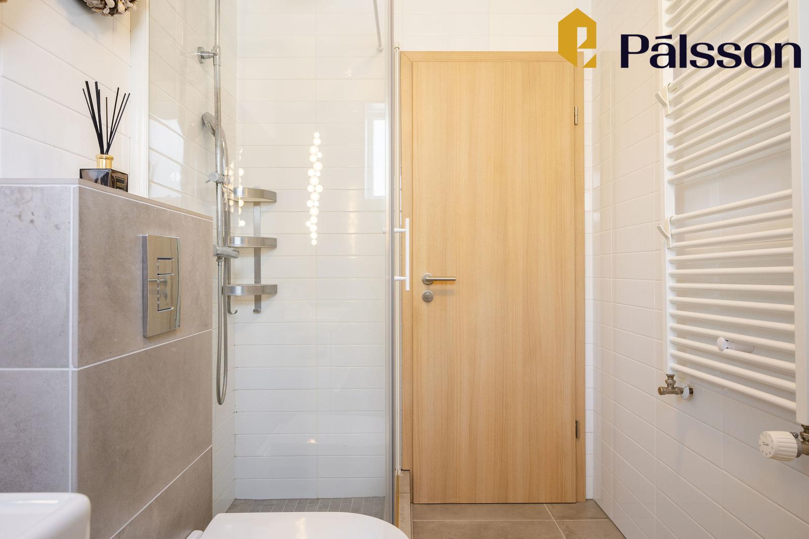 Anddyri er með góðum skápum og handklæðaofni. Flísar á gólfum.
