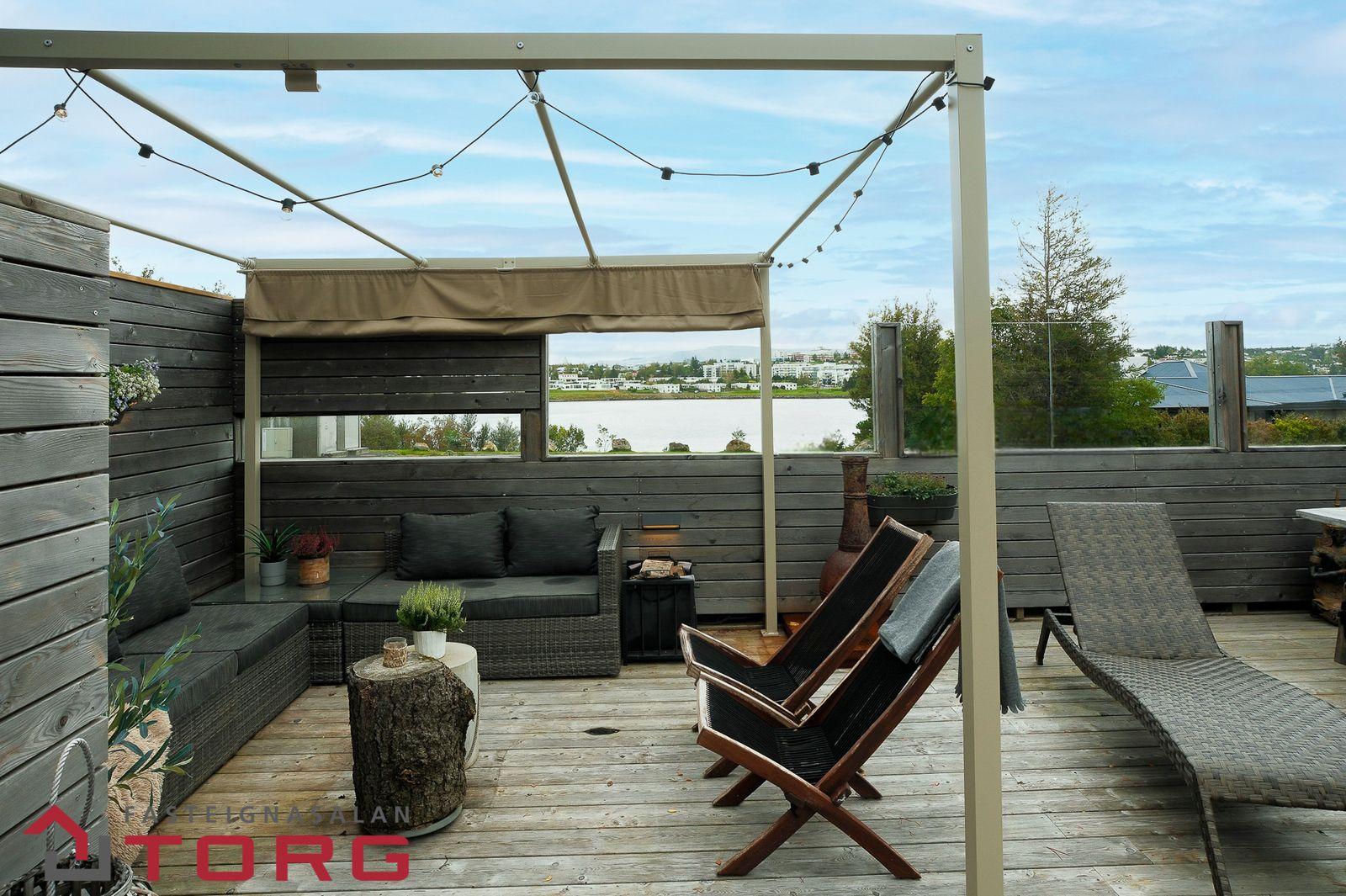 2) afgirt með útieldhús, heitum potti, útisturtu og geymsluskúr. Lumex sá um ljósahönnun, en veröndin er einstaklega falleg í myrkri.