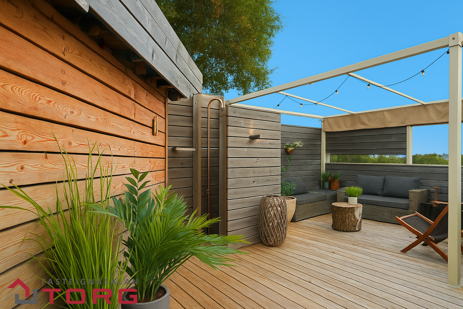 Timburverönd með skjólveggjum, útieldhúsi, innbyggðum heitum potti, útisturtu og geymsluskúr byggður (2018)