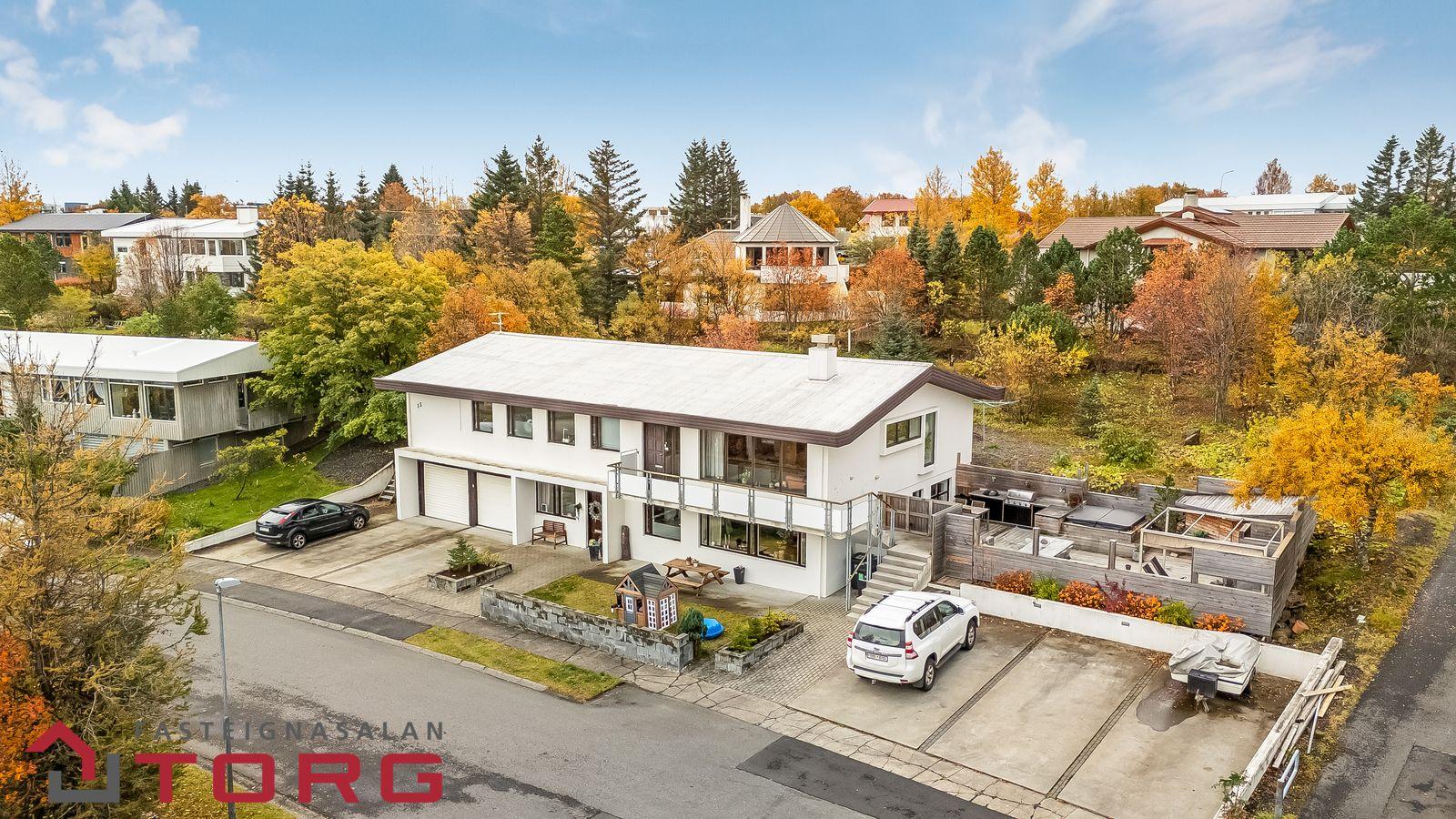 Lóðin er stór með góðum garði, steypt bílstæði með snjóbræðlukerfi, hlaðinn veggur og blómabeð með lýsingu framan við hús. Tvö stæði tilheyra íbúð jarðhæðar.