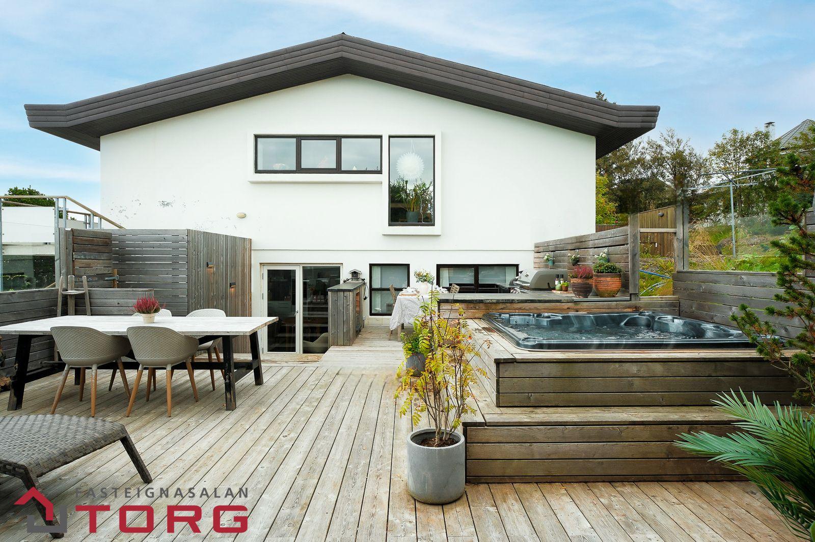 Fasteignasalan TORG og Margrét Rós lgf. kynna í sölu fallega og rúmgóða neðri sérhæð á Arnarnesi, með bílskúr og stórri afgirtri timburverönd innst í botnlanga við Þernunes 13. Eignin telur tvö svefnherbergi, eldhús, sjónvarsphol, borðstofu og stofu með útgengi á rúmgóða timburverönd með heitum potti, útieldhús og geymsluskúr, tvö baðherbergi, geymslu og bílskúr. Íbúðin hefur verið mikið endurnýjuð á undanförnum 10-15 árum, þ.m.t. gólfefni, hurðar og tæki. Raflagnir hafa verið endurnýjaðar og hitalagnir verið settar í gólfin. Fullkomið loftræstikerfi liggur um tvö herbergi og baðherbergin tvö og í gegnum bílskúrinn. Húsið er einstaklega vel staðsett, innst í botnlanga með óhindrað sjávarútsýni úr stofu til vesturs/norðurs í átt að Kópavoginum. Tvö bílastæði fylgja eigninni á lóðinni og næg gestastæði fyrir neðan götu. Allar nánari upplýsingar veitir Margrét Rós lgf. í s. 856-5858 eða margret@fstorg.is *** SÆKJA SÖLUYFIRLIT HÉR *** Birt stærð eignar skv. fasteignaskrá HMS er 139,9 m2 þar af er íbúð 121,6 m2 m2 og innbyggður bílskúr 18,3 m2ERTU Í SÖLUHUGLEIÐINGUM? SMELLTU HÉR FYRIR FRÍTT VERÐMATLýsing eignar:Forstofa, komið er inn um sérinngang í opna forstofu með góðum fataskáp og náttúrustein á gólfi.