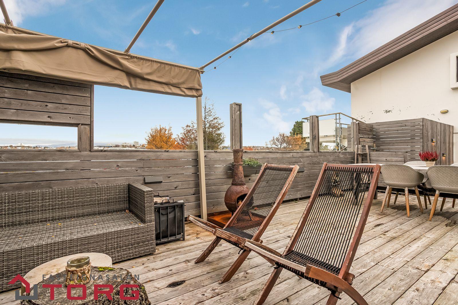 Timburverönd er mjög rúmgóð (c.a. 80 m
