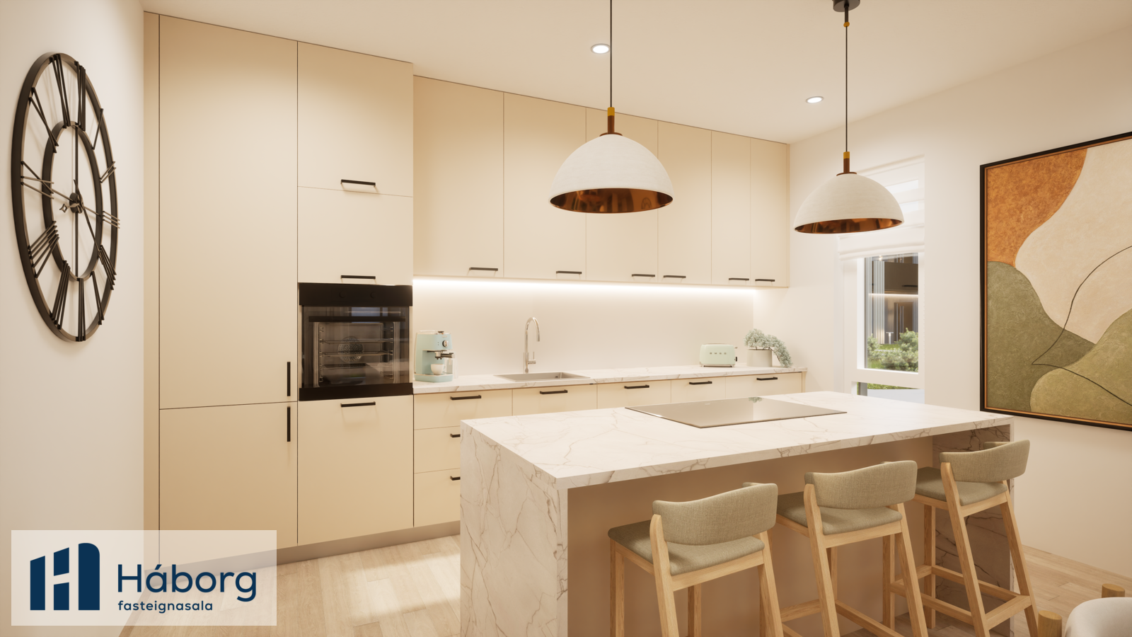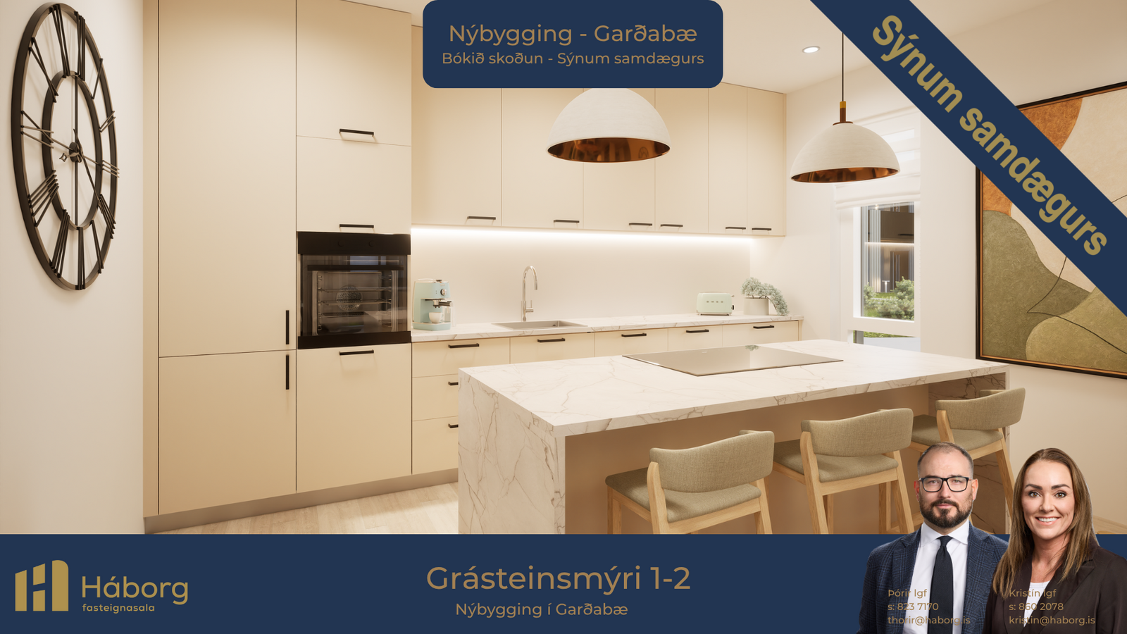 Háborg fasteignasala kynnir Grásteinsmýri 1, Garðabæ. Nýbyggingin er staðsteypt, einangruð að utan og klædd með ál- og bambus klæðningu. Góðar 2ja, 3ja 4ra og 5 herbergja íbúðir í litlu fjölbýli með lyftu. Útsýni er úr flestum íbúðum og timbur-verönd fylgir íbúðum á 1. hæð. Íbúðirnar afhendast án megin gólfefna en baðherbergi eru flísalögð að hluta. Næg bílastæði á lóð. Áætluð afhending íbúða er í mars-apríl 2026.Sölusíða GrásteinsmýriNýr valkostur í fjármögnun. Kaupendur geta nýtt sér nýjan sjóð Öxar 20 sem styður þá með því að fjárfesta með þeim allt að 20% af kaupverði. Kynntu þér málið hér Öxar.isNánari lýsing á íbúð 104 2ja herbergja: Stærð 67,7 fm. Sérinngangur. Þegar komið er í forstofu eru góðir fataskápar. Barnaherbergi er rúmgott og bjart með góðum fataskápum. Hjónaherbergi er einnig rúmgott og bjart með góðum fataskápum. Baðherbergi er með glugga og góðri snyrtiaðstöðu. Einnig er aðstaða fyrir þvottavél og þurrkara á baði. Alrými er mjög rúmgott og bjart með opið eldhús með eyju sem hægt er að sitja við. Stofur eru rúmgóðar og bjartar. Úr alrými og stofu er útgengt á timbur-verönd (suðvestur) 17,2 fm að stærð. Snýr að inngarði. Eigninni fylgir stæði í bílakjallara merkt B12 og geymsla að stærð 9,2 fm.Nýjar, bjartar og vandaðar íbúðir með góðri lofthæð, þar sem náttúra, ró og nútímaleg hönnun mætast.Innréttingar í íbúðum: AXIS innréttingar í litnum CashmereGrey. AEG innbyggð heimilistæki, ísskápur, uppþvottavél, helluborð og bakarofn. Baðherbergi eru flísalögð að hluta með 60×60 Patch Beige flísum (Ragno). Grohe blöndunartæki eða sambærileg. Egill Árnason hurðir, lamir og hurðabúnaður.
