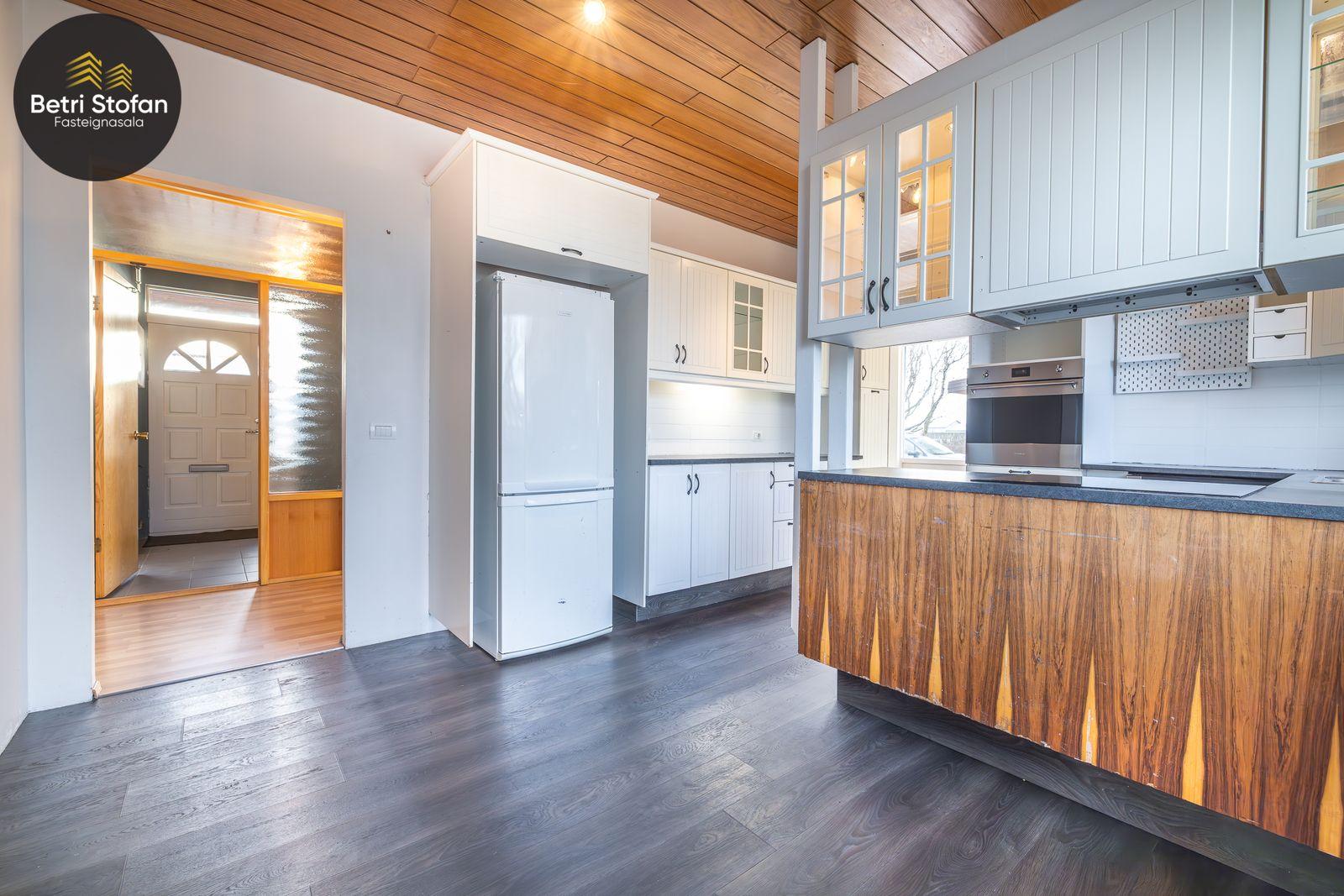 Eldhús: Rúmgott eldhús, gengið í innaf stofu. Ljós eldhúsinnrétting með góða skápaplássi og borðkrók.
