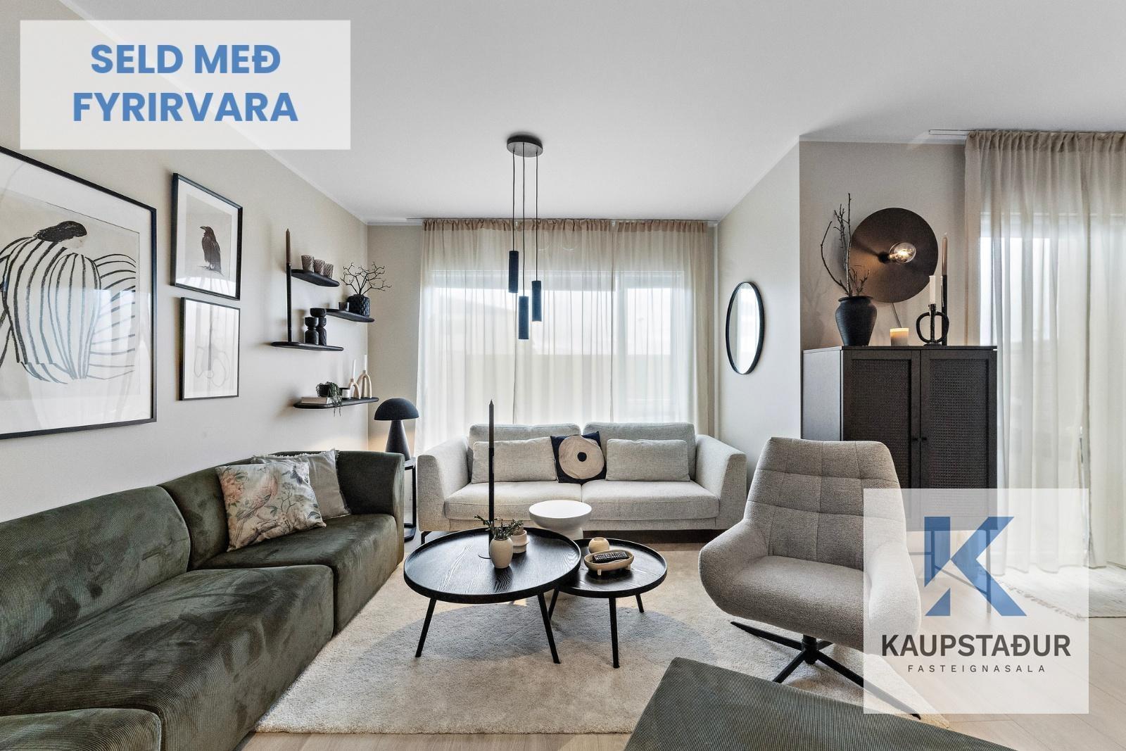 Gólfefni: Flæðandi parket á herbergjum og gangi. Flísar á baðherbergi og þvottahúsi.