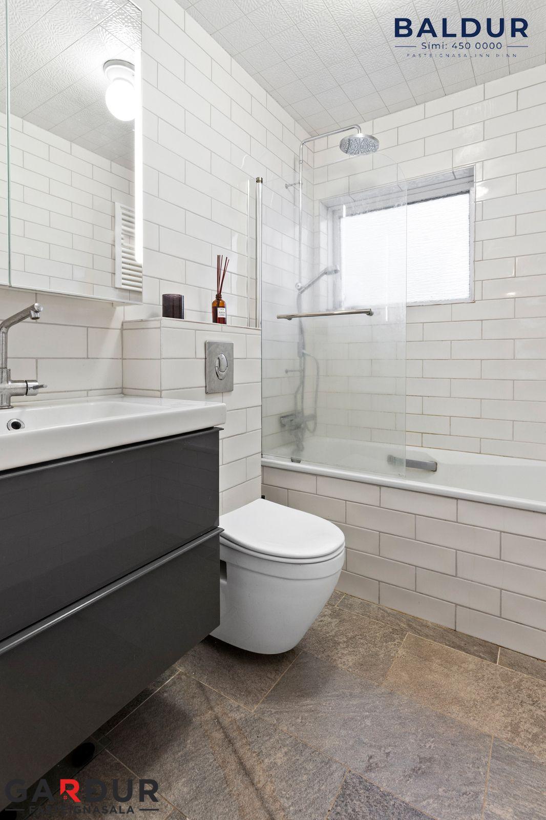 Baðherbergi: Flísalagt í hólf og gólf. Innrétting við vaskm, vegghengt klósett, baðkar með sturtu og gleri, handklæðaofn og opnanlegur gluggi.