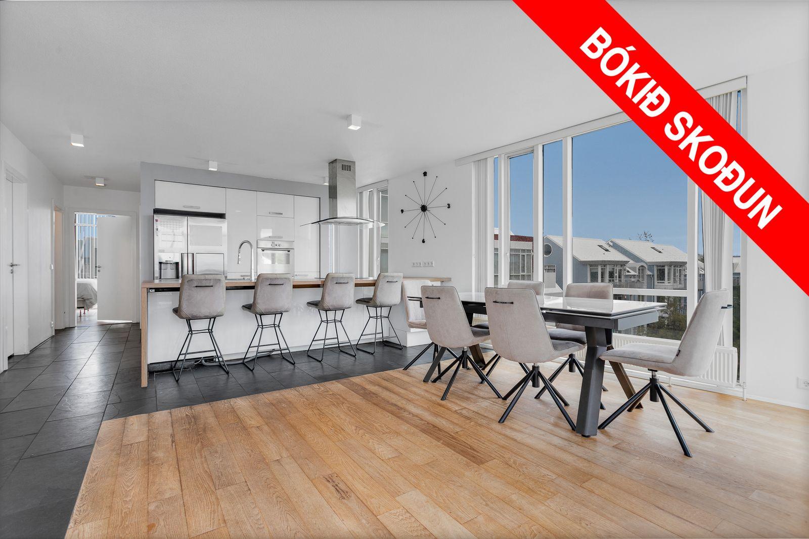 Domusnova fasteignasala og Sölvi Sævarsson kynna í sölu: Bjarta og vel skipulagða 5-6 herbergja íbúð á tveimur hæðum ásamt stæði í bílageymslu við Naustabryggju 12 við bryggjuhverfi Grafarvogs. Stórar stofur og tvö baðherbergi. Mikil og glæsileg lofthæð, tvennar svalir og stór útbyggður gluggi á alrými á neðri hæð sem gefur góða birtu inn í alrýmið.