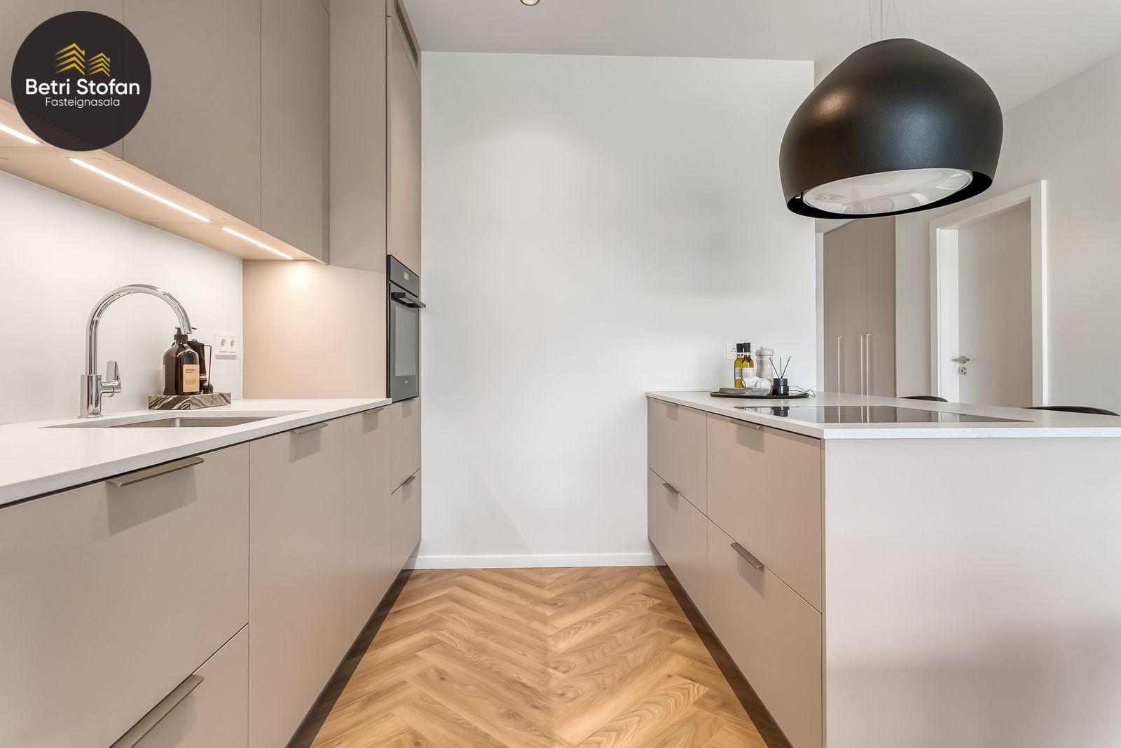 Eldhús er vel útbúið, sérsmíðaðar Voke III innréttingar, á borðplötum er kvarts steinn. Vönduð tæki eru í eldhúsi, innbyggður ísskápur og uppþvottavél. ofn í vinnuhæð, eldhús- og blöndunartæki að vandaðri gerð.
