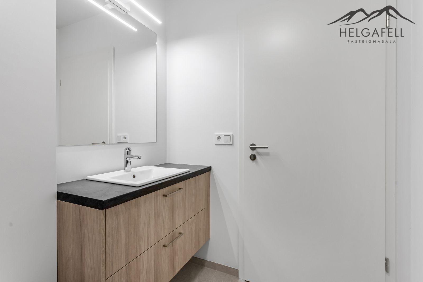 Gólfhiti er á baðherbergi, auk þvottaaðstöðu.
