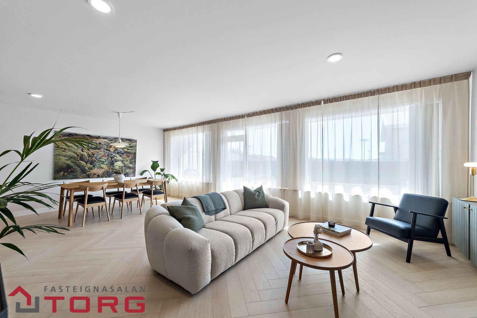 Eldhús, er opið við forstofu og stofu með parket á gólfi. Allt nýlega endurnýjað, falleg nnrétting með hornlaga setbekk við glugga, innfeldum tvöföldum ísskáp ásamt uppþvottavél og vönduðum Quartzite stein á borðum. Samsung bakaraofn og combi ofn í vinnuhæð, Siemens 80cm helluborð og Lusso stonebrass blöndunartæki.