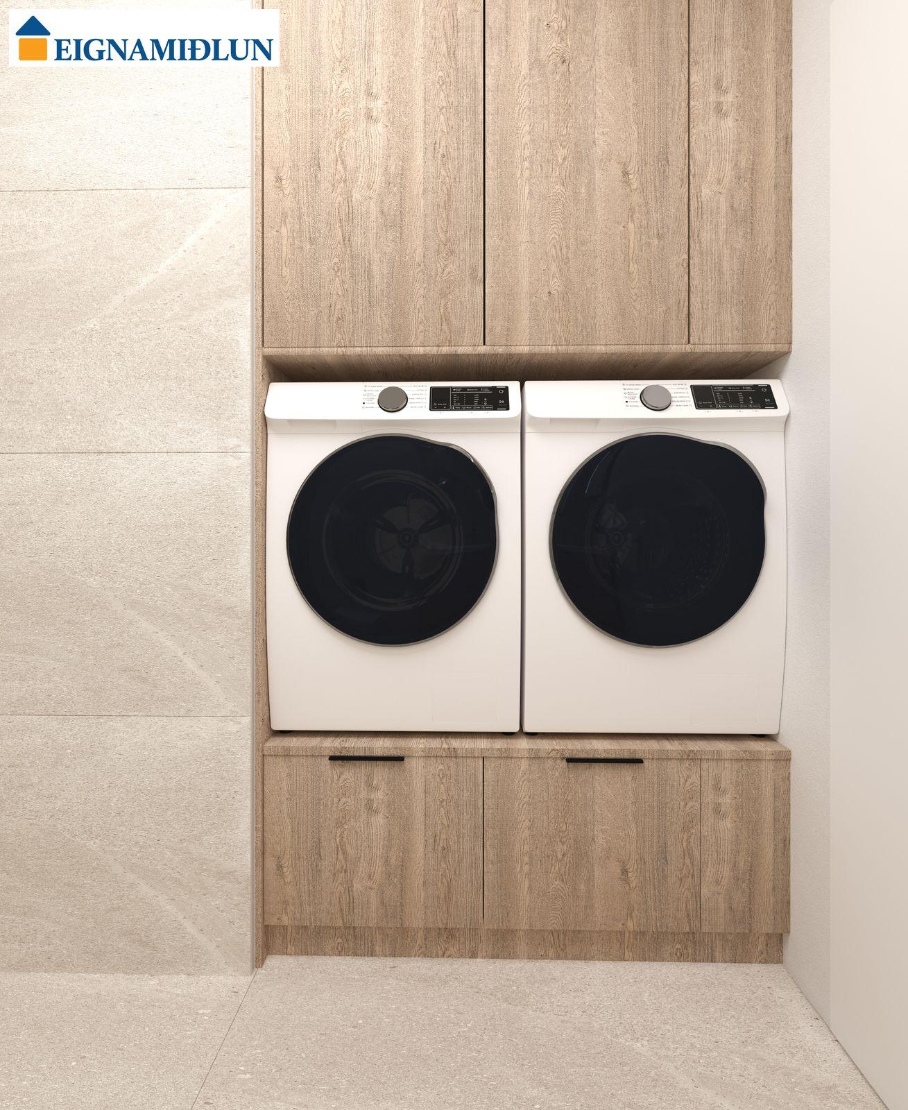 Innréttingar á böðum og þvottahúsum eru sömuleiðis sérsmíðaðar hjá Selós ehf. Silestone steinborðplötur á baði með undirlímdri hvítri handlaug, plastlagðar borðplötur undir þvottavél og þurrkara. Vönduð Grohe blöndunartæki og 25 sentimetra sturtuhaus í sturtum.