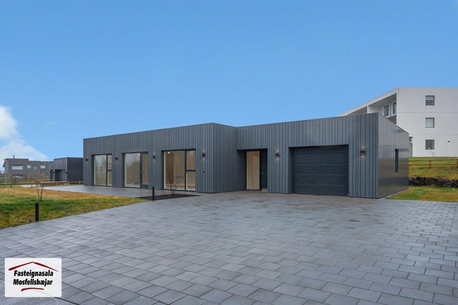 Fasteignasala Mosfellsbæjar kynnir: Nýtt - Glæsilegt 250,1 m2, einbýlishús á einni hæð með innbyggðum bílskúr við Lóugötu 24 í Mosfellsbæ. Eignin er skráð 250,1 m2, þar af einbýli 202,2 m2 og bílskúr 47,9 m2. Eignin skiptist í anddyri með baðherbergi, sambyggða stofu, borðstofu og eldhús, sjónvarpshol, hjónaherbergi, þrjú barnaherbergi, baðherbergi og þvotthús. Úr anddyri er innangengt í bílskúr/geymslu. Frábær staðsetning innarlega í botnlanga. Stutt í Helgafellsskóla sem er bæði grunn- og leikskóli. Stutt er í náttúruna og fallegar gönguleiðir. Eignin er laus til afhendingar við kaupsamning