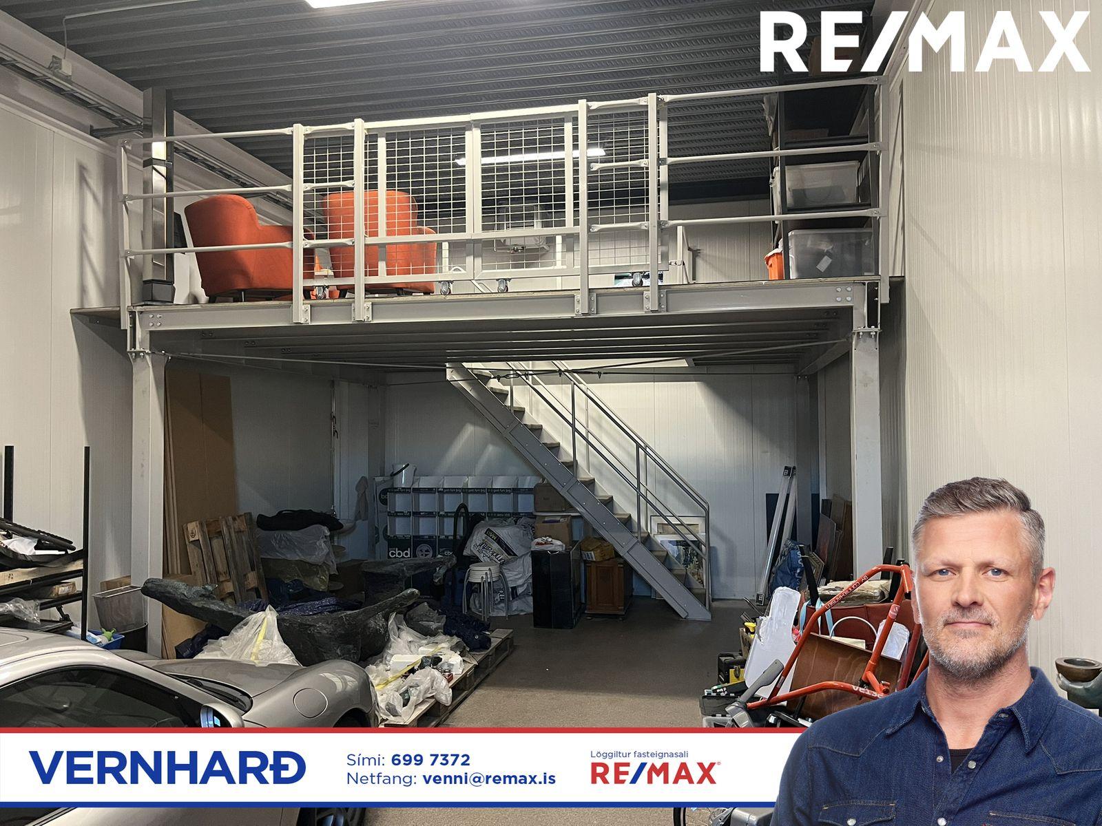 Vernharð Þorleifsson lgf. og Magga Gísladóttir lgf. kynna geymsluhúsnæði sem telur 60,9 fm gólfflöt ásamt 24 fm millilofti. Húsið er stálgrindarhús með 2,85 m hárri innkeyrsluhurð og gönguhurð. Lofthæð er 5 m. Stammi fyrir wc og vaskur með heitt og kalt vatn. Gólf er með niðurfalli. Aðkoma er góð og bílaplan er malbikað. Hæð hurðar er 2,85metrar. Lofthæð er um 4,8 metrar. Frekari upplýsingar veita Vernharð Þorleifsson löggiltur fasteignasali í síma 699-7372 / venni@remax.is og Magga Gísladóttir löggiltur fasteignasali í síma 698-7494 / magga@remax.is Kíktu í heimsókn til okkar á Facebook eða á Instagram