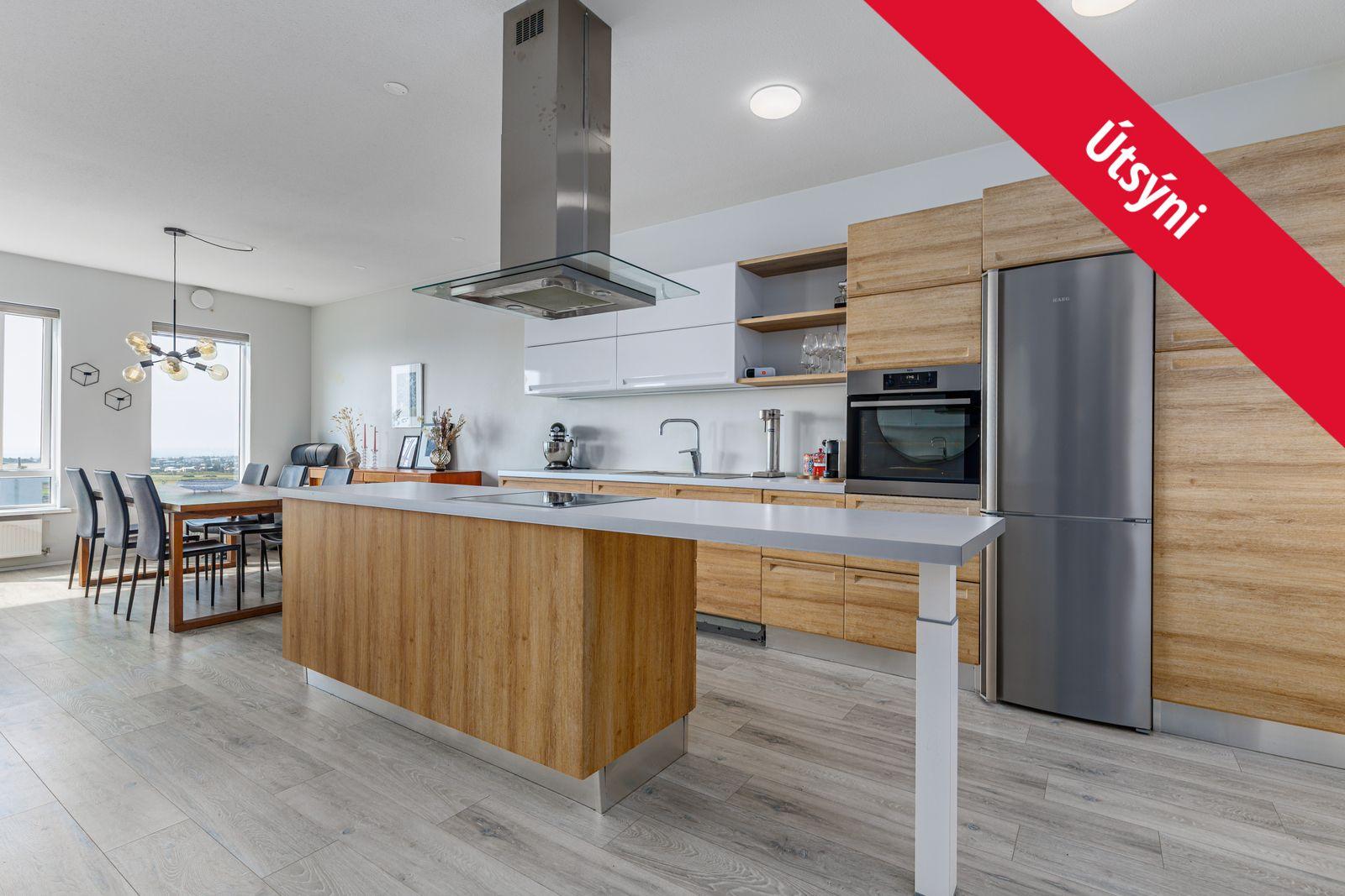 Eldhús: Er með eyju. Glæsileg innrétting með miklu skápaplássi, spónlögð og hvít sprautulökkuð, plastlögð borðplata, vönduð tæki frá AEG og innbyggð uppþvottavél.