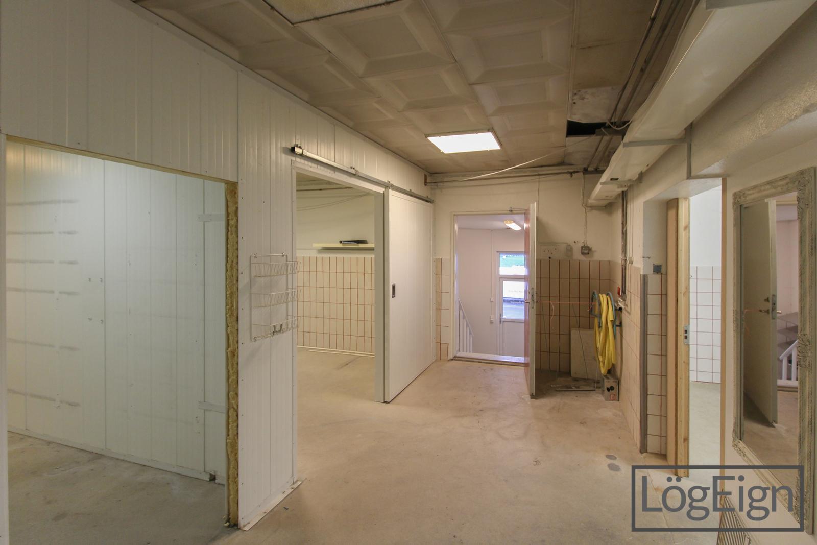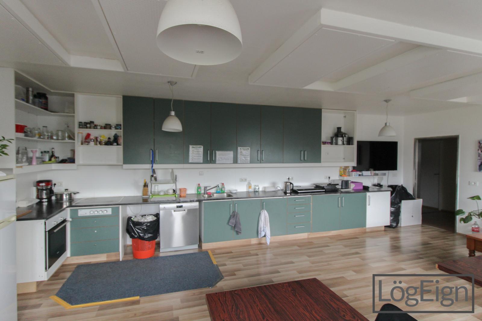 Nánar tiltekið er um að ræða eignarhluta með 16 fastanúmerum þar sem heimilt er að gera 12 íbúðir. Samtals stærð eignarinnar er um 870 m2. 8 herbergi eru á efstu hæðinni sem hafa verið í útleigu til fyrirtækja á svæðinu. Þar er salernis og sturtuaðstaða í sameiginlegu rými og svo eldhús/ setustofa í stóru sameiginlegu herbergi. Á neðri hæðinni eru svo rými sem hafa verið notuð sem iðnaðarbil sem gert er ráð fyrir að verði breytt í íbúðir. Gert er ráð fyrir 12 íbúðum á 1 og 2 hæð, geymslum í kjallara sem tilheyra íbúðum ásamt 4 stærri rýmum í kjallara sem geta nýst fyrir ýmsa sameiginlega aðstöðu fyrir íbúðirnar.