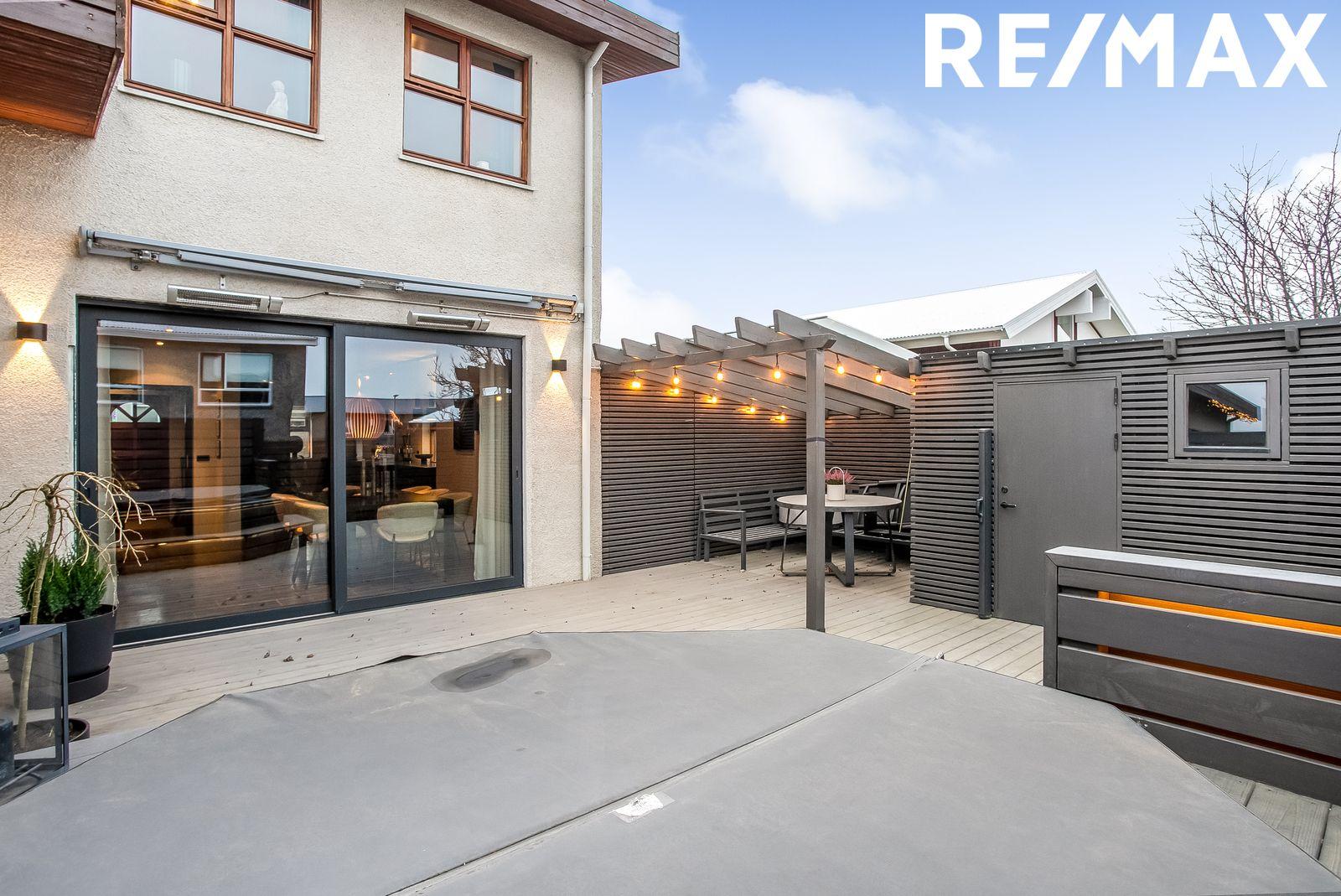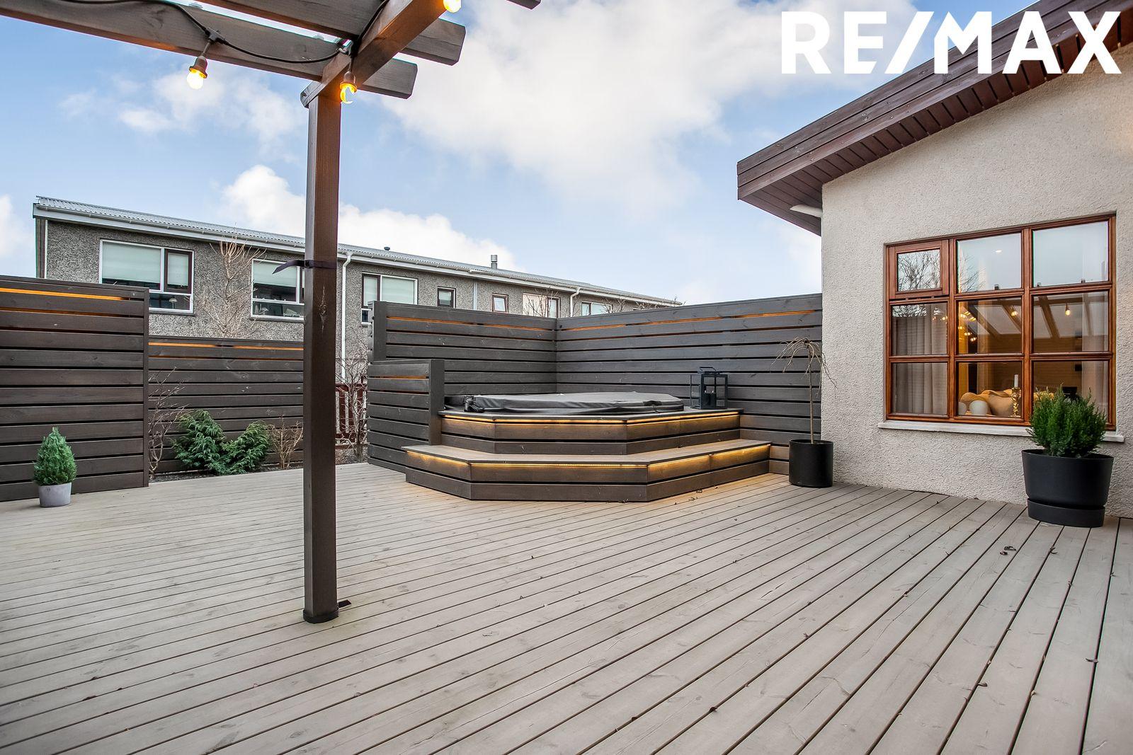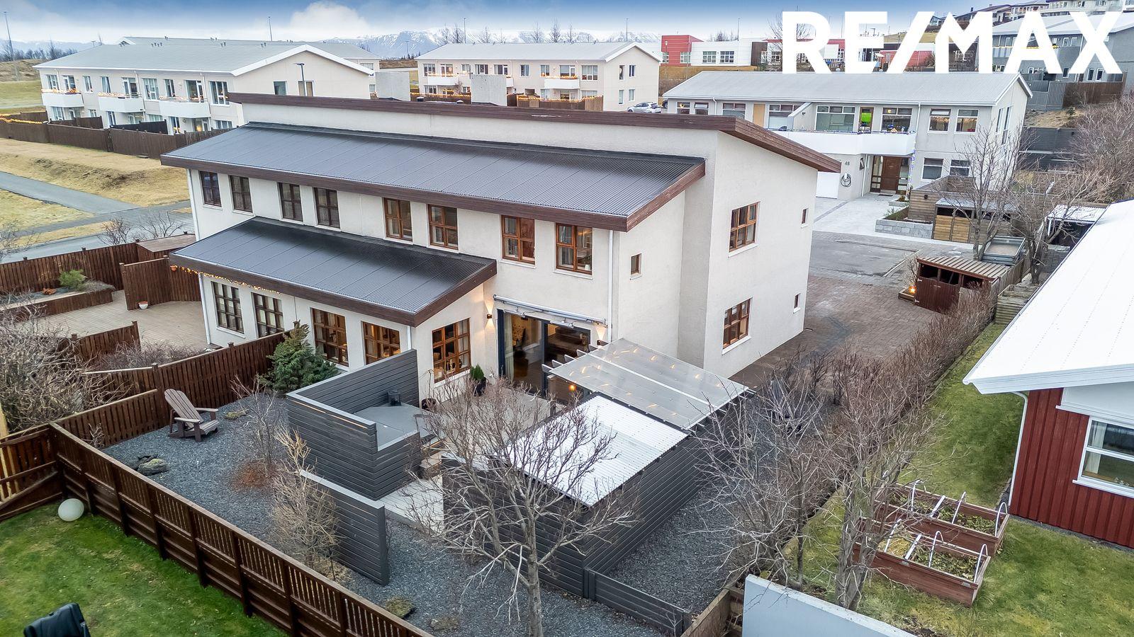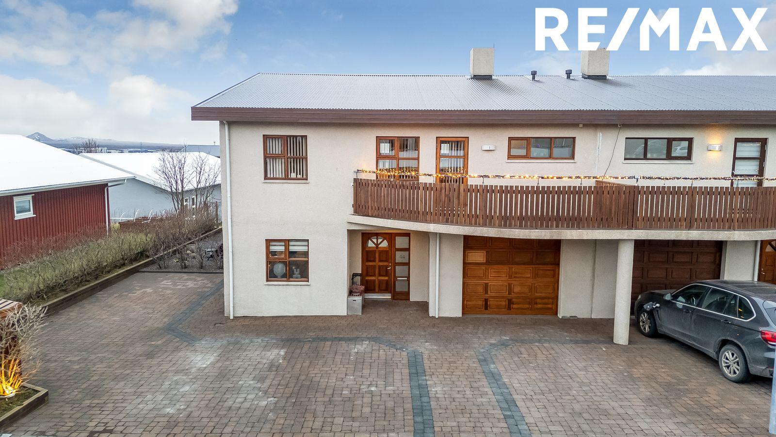 Nánari lýsing: Forstofa: Með rúmgóðum fataskáp og flísum á gólfi. Salerni: Með upphengdu salerni og vask. Stofa: Stofa, borðstofa og eldhús mynda gott og bjart alrými flísar á gólfi. Eldhús: Er með fallegri sérsmíðuðum innréttingum og góðri eldunaraðstöðu. Gott og mikið borð og skápaplássi. Svefnherbergi: Er með góðum gluggum og rúmgóðum skápum, parket á gólfi. Svefnherbergi: Er með góðum gluggum og rúmgóðum skápum, parket á gólfi. Hjónaherbergi: Parket á gólfi, rúmgott með miklu fatahirslum. Baðherbergi: Er með fallegri innréttingu, flísalagt gólf og veggir. Flísalögð sturta og sturtugler. Upphengt salerni. innbyggð tæki. Þvottahús: Með vaski og flísalagt gólf. Útisvæði: Garðurinn er fallegur, með timburverönd í bland við viðhaldslítiln gróður. Á pallinum er heitur pottur og snyrtileg setustofa ásamt útigeymslu. Bílaplanið er hellulagt með snjóbræðslu.