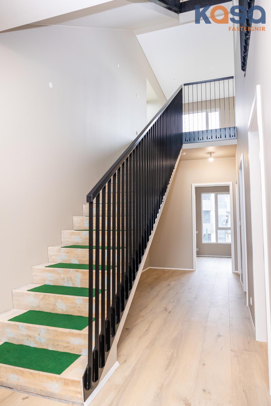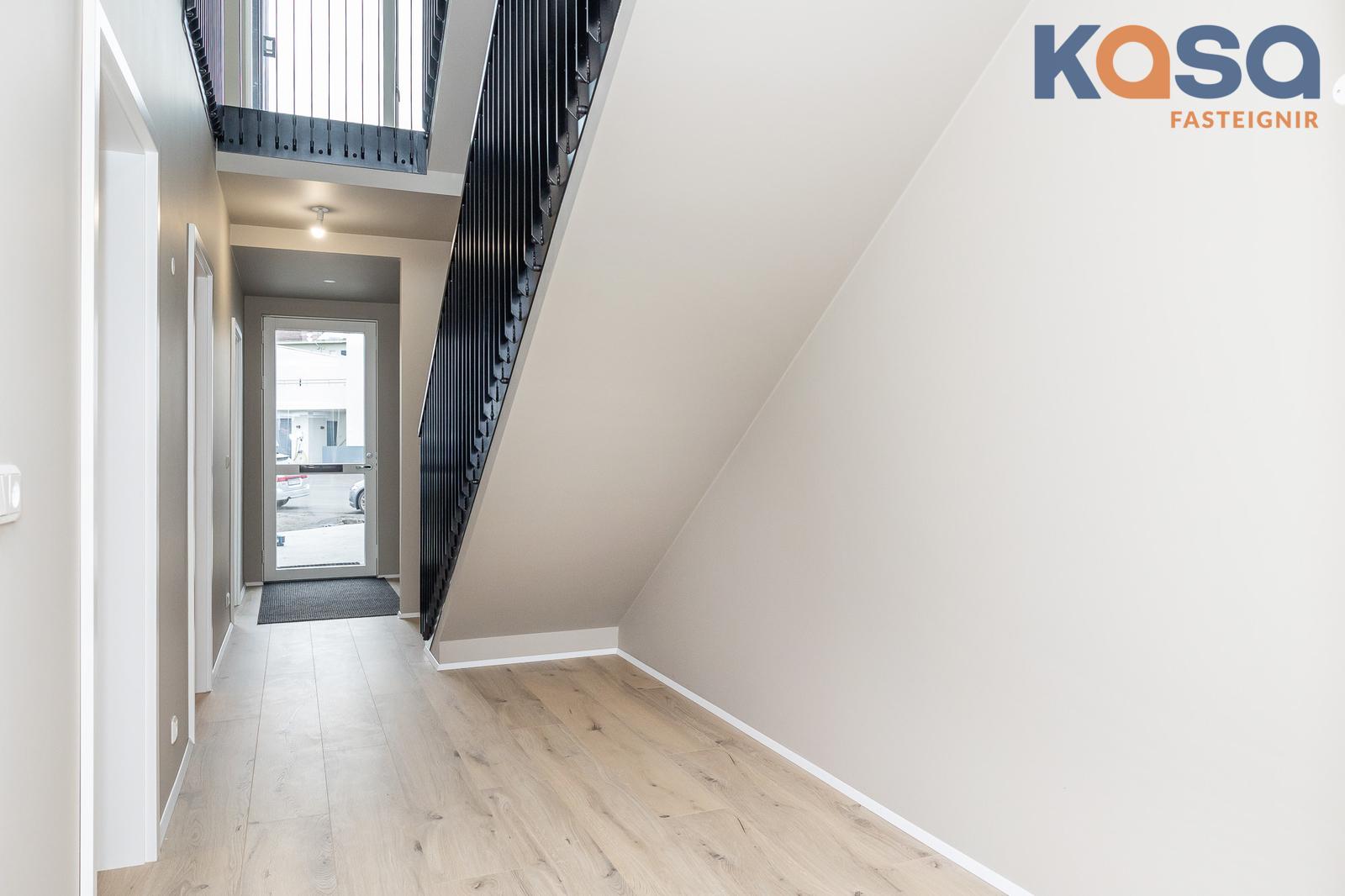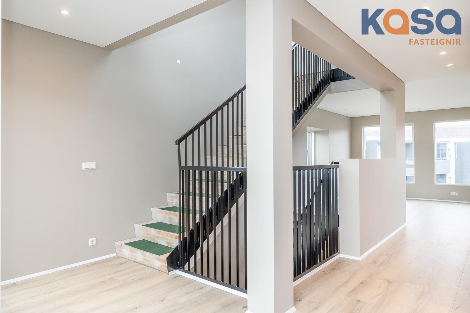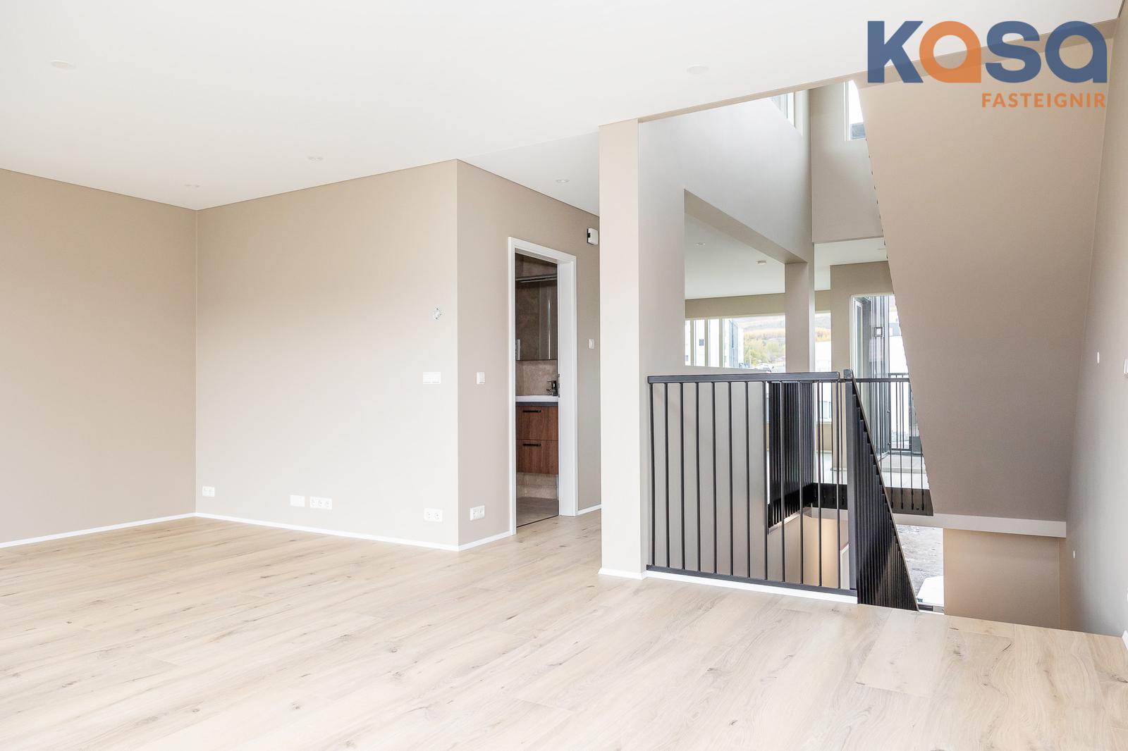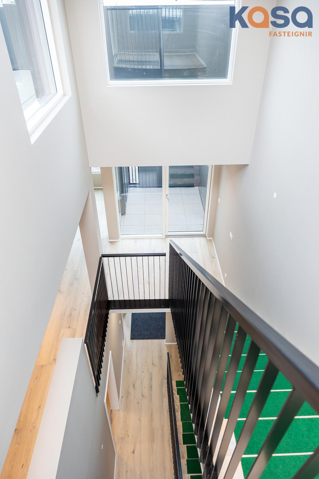 Eignin er skemmtilega hönnuð þar sem svefnrými, baðherbergi og bílskúr eru á jarðhæð, stofa, eldhús og baðherbergi á efrihæð og rúmgóð verönd á þaki eignar.