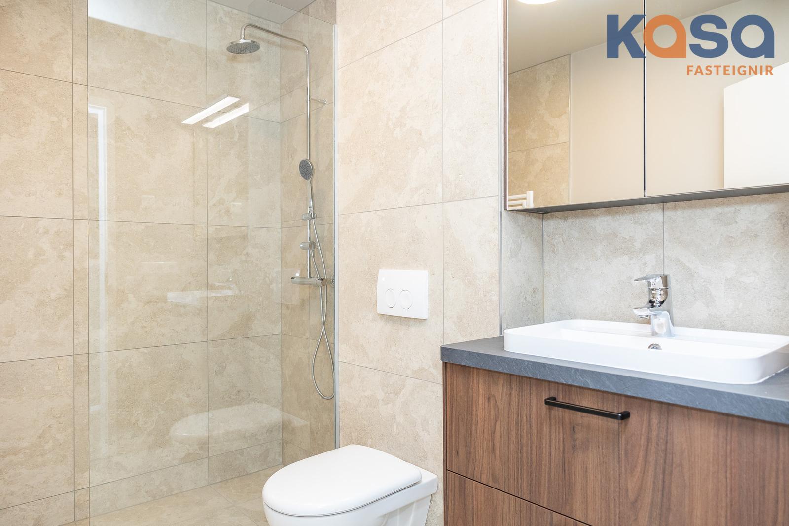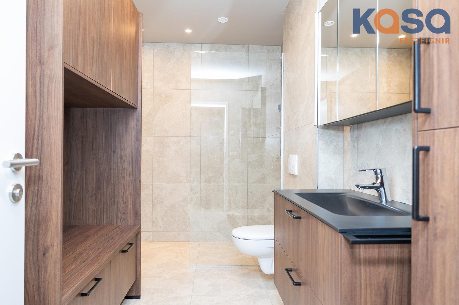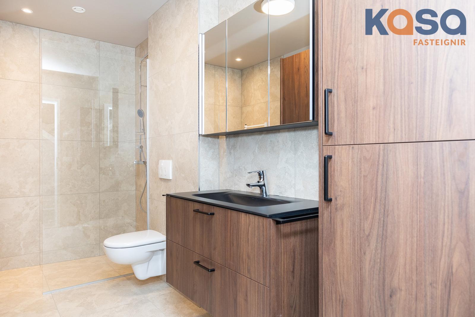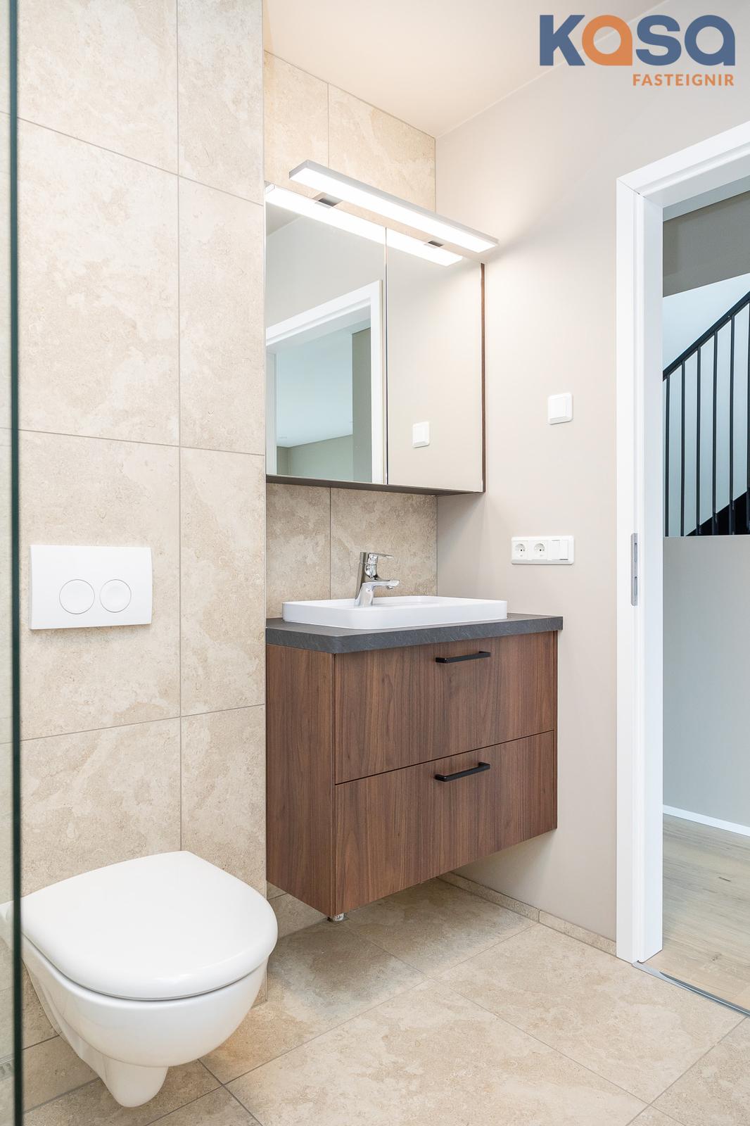 Baðherbergi: Eru tvö í eigninni. Eitt er á jarðhæðinni, þar eru flísar á gólfi og á tveimur veggjum, upphengt salerni, handklæðaofn og walk-in sturta með gleri. Innrétting er í hnotulíki með svartri plötu og handlaug. Speglaskápur með lýsingu er fyrir ofan handlaug og stakur skápur við hlið innréttingar. Innrétting fyrir þvottavél/þurrkara er á baðherberginu, skúffur fyrir neðan og skápar fyrir ofan. Tvöfaldur skápur er við hliðina á innréttingunni.
