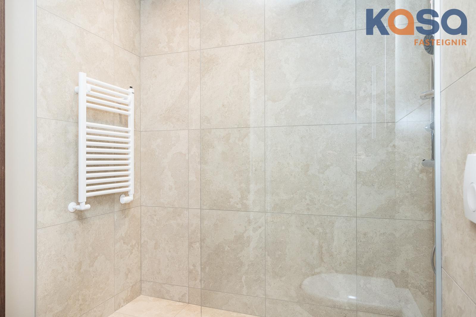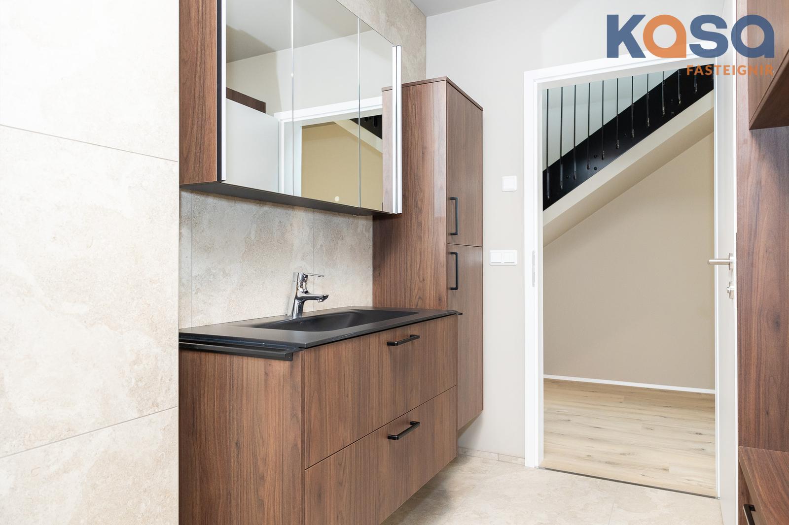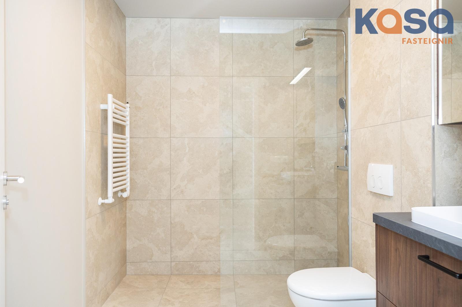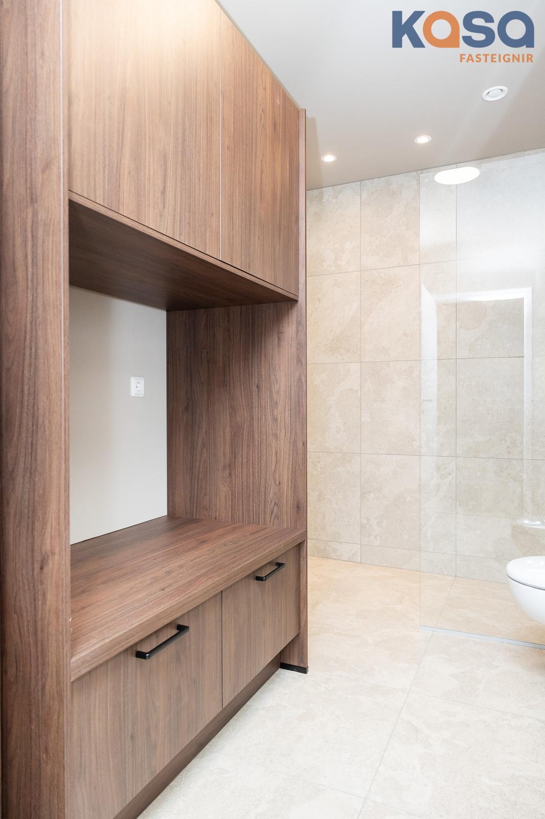 Baðherbergi: Eru tvö í eigninni. Eitt er á jarðhæðinni, þar eru flísar á gólfi og á tveimur veggjum, upphengt salerni, handklæðaofn og walk-in sturta með gleri. Innrétting er í hnotulíki með svartri plötu og handlaug. Speglaskápur með lýsingu er fyrir ofan handlaug og stakur skápur við hlið innréttingar. Innrétting fyrir þvottavél/þurrkara er á baðherberginu, skúffur fyrir neðan og skápar fyrir ofan. Tvöfaldur skápur er við hliðina á innréttingunni.