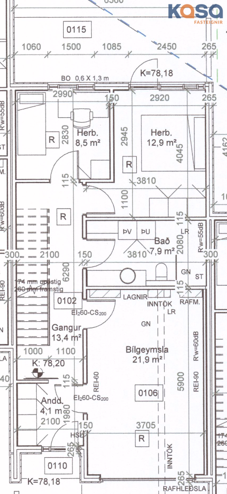 Veggir eru 100 mm þykkir, klæddir með öndunnardúk undir 100 mm þykka harðpressaða steinull sem lokast með þar til gerðum brunadúk og lektum undir klæðningu.