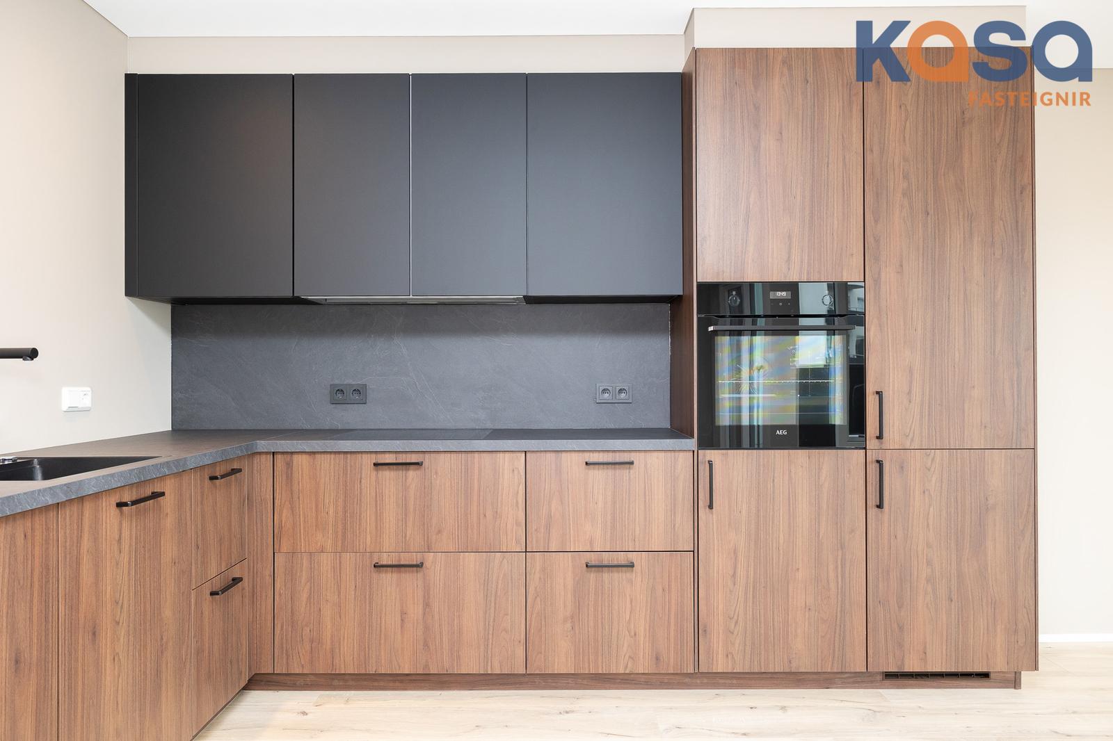 Eldhús: Vönduð innrétting í hnotulíki með grárri bekkplötu og svörtum vaski. Mjúklokun á skúffum og skápum. Hnífaparabakki og ruslafata fylgir. Innbyggður ísskápur með frysti og innbyggð uppþvottavél fylgja með við sölu eignar. Helluborð er sléttfellt og gufugleypir blæs út. Úr eldhús er gengið út á vestursvalir.