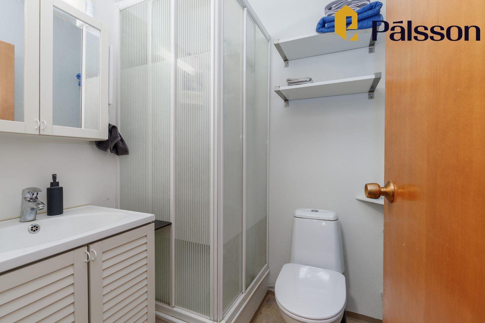 Baðherbergi: baðherbergið er með hvítri innréttingu, sturtu og salerni.