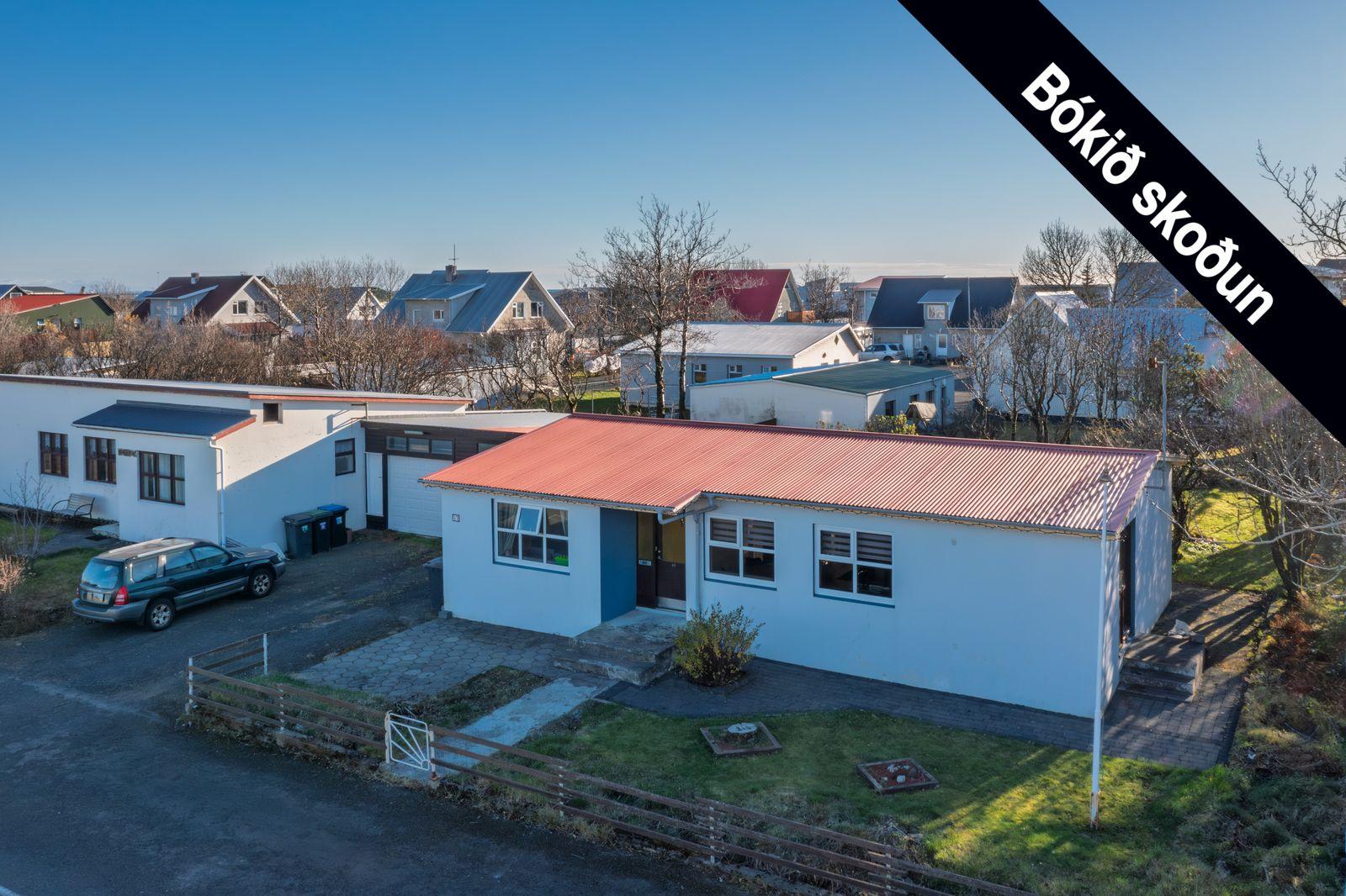 Bílskúrinn: Rúmgóður bílskúr, heitt og kalt vatn, hiti, 3ja fasa rafmagn, rafhleðslustöð, bílskúrshurðaopnari, hitastýring fyrir heitan pott í bílskúr, ómálað gólf.