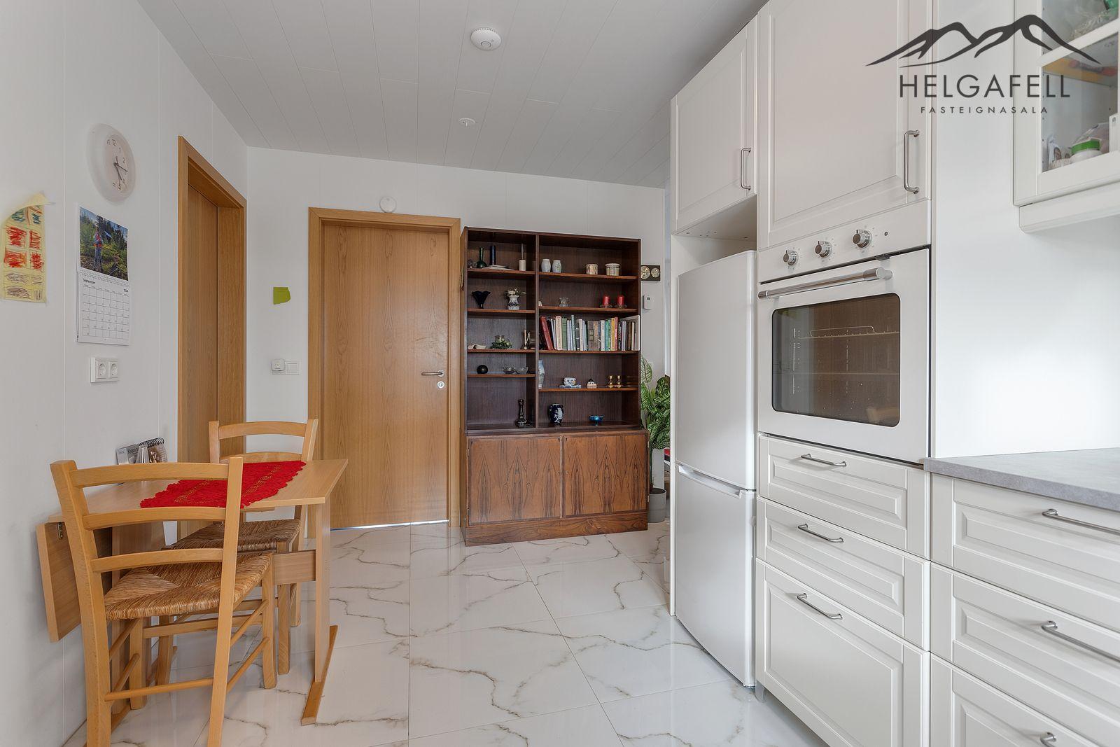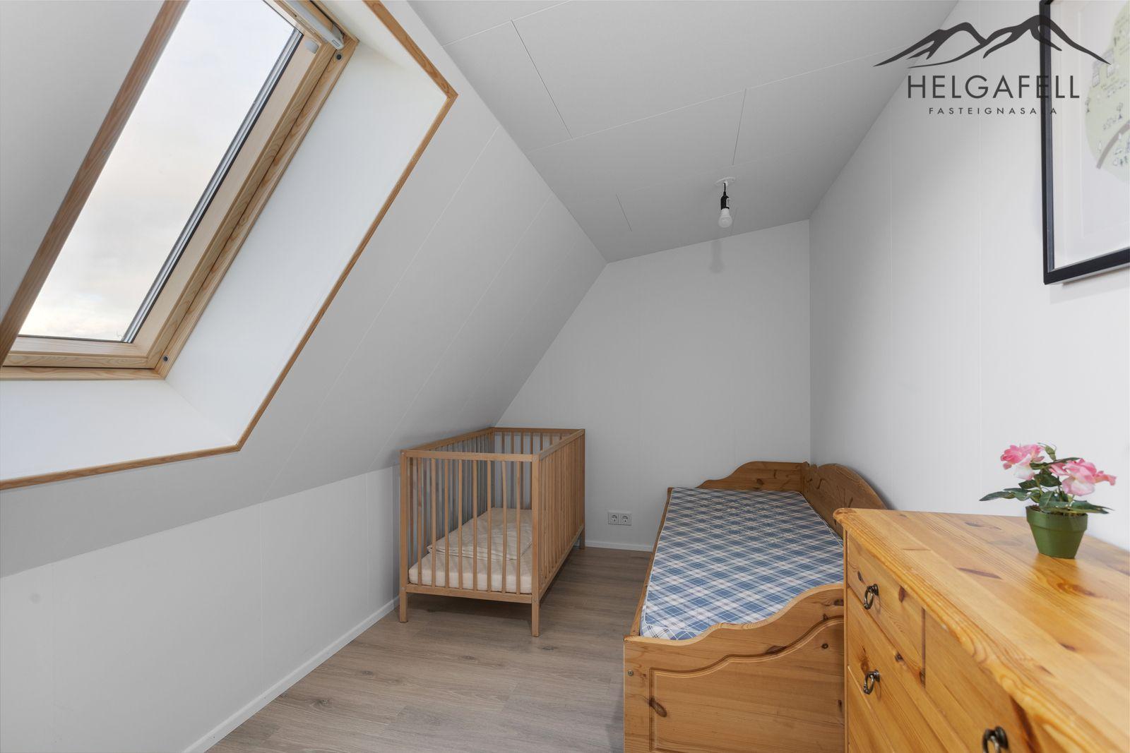 Nánari lýsing: Teppalagður stigi liggur frá gangi á efri hæð. Þaðan liggur gangur að öðrum rýmum. Harðparket á gólfi. Eldhús með lítilli innréttingu þar sem gert er ráð fyrir litlum ísskáp. Stálvaskur. Á baðherbergi er vaskinnrétting, upphengt salerni, baðkar og gluggi. Fjögur parketlögð herbergi.