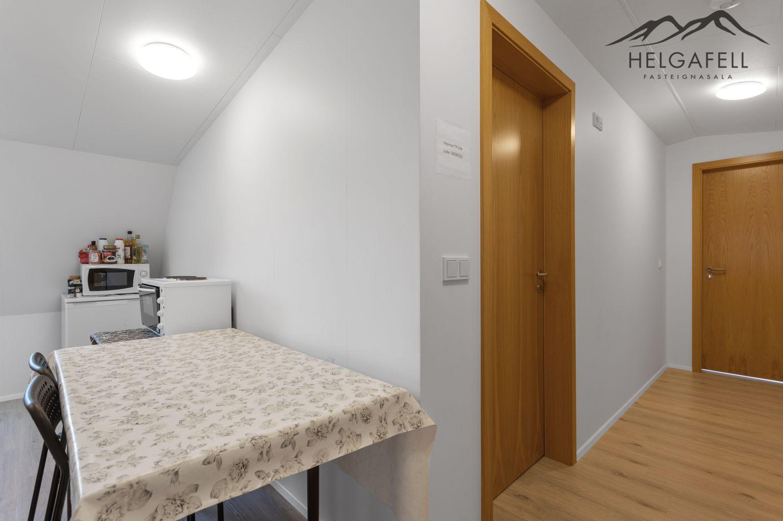 Alrými (tækjasalur) með harðparketi á gólfi. Þaðan er innangengt í kaffistofu og herbergi. Kamína. Kaffistofa með innréttingu. Stálvaskur og Gorenje eldavél, borðkrókur og gluggi. Tvö herbergi, bæði með harðparket á gólfi. Flísalagt baðherbergi, vaskinnrétting, speglaskápur, upphengt salerni og sturta. Opnanlegur gluggi og tengi fyrir þvottavél.