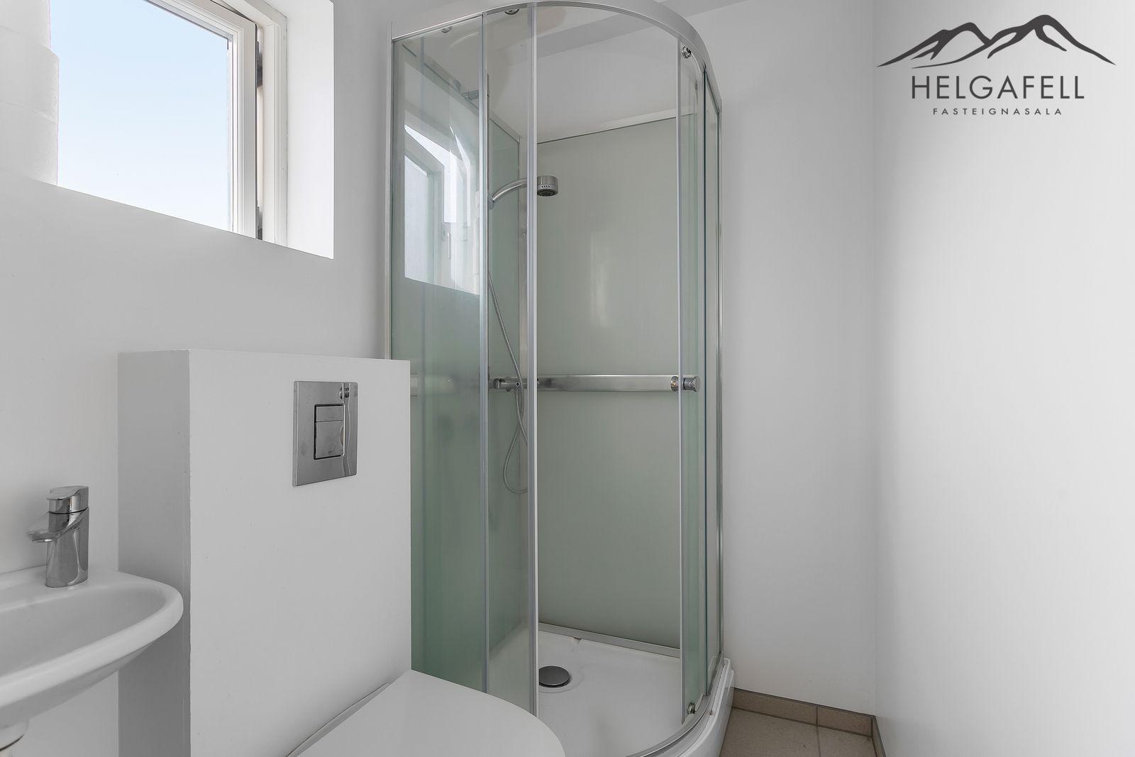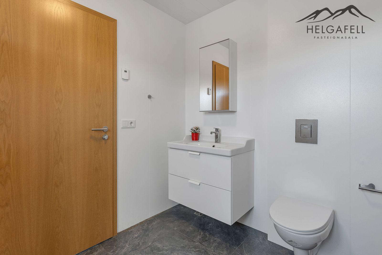 Nánari lýsing: Flísalagður með geymslu. Inntök og rafmagnstafla, hitakútar, þvottavaskur og gönguhurð í bílskúrshurð. Flísalagt baðherbergi með handlaug, sturtuklefa, opnanlegum glugga og upphengdu salerni. Útgengt á hellulagða verönd með heitum potti.