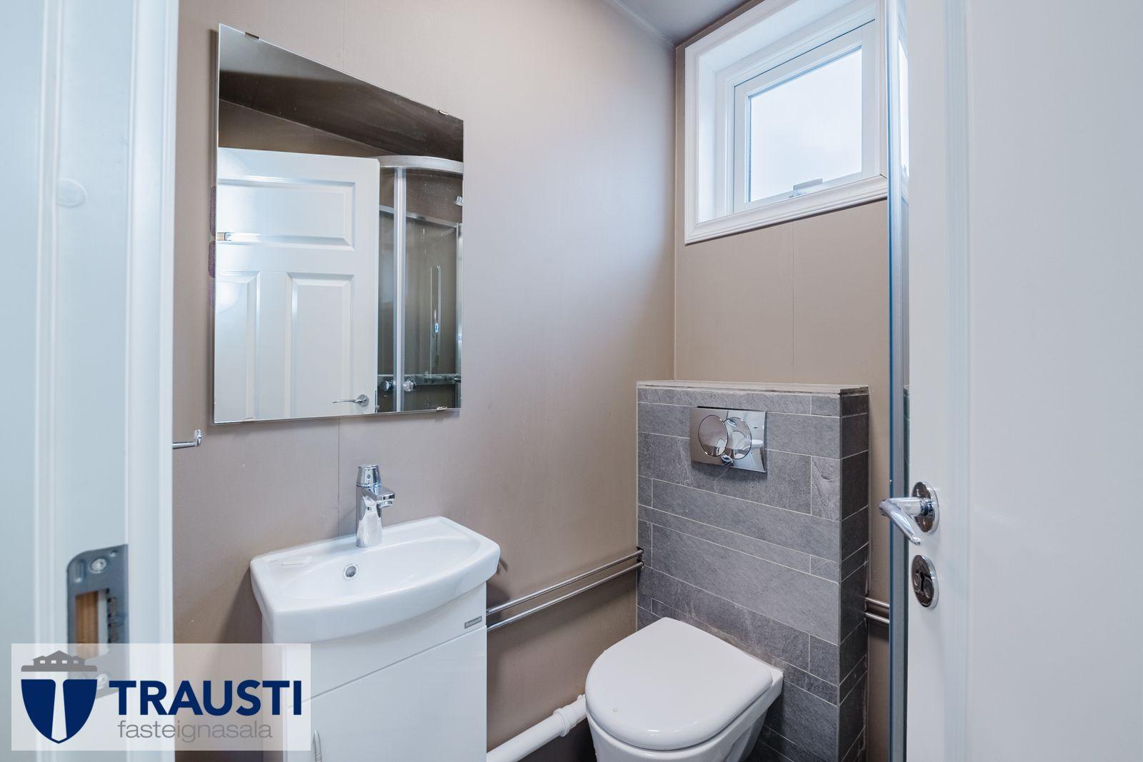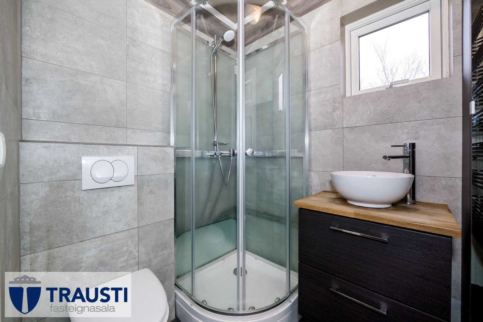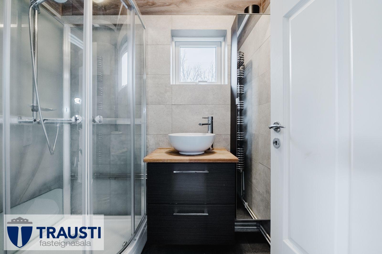 Baðherbergi er með sturtuklefa, upphengdu klósetti, vask og skúffum, glugga og handklæðaofni. Baðherbergið er flísalagt í hólf og gólf.
