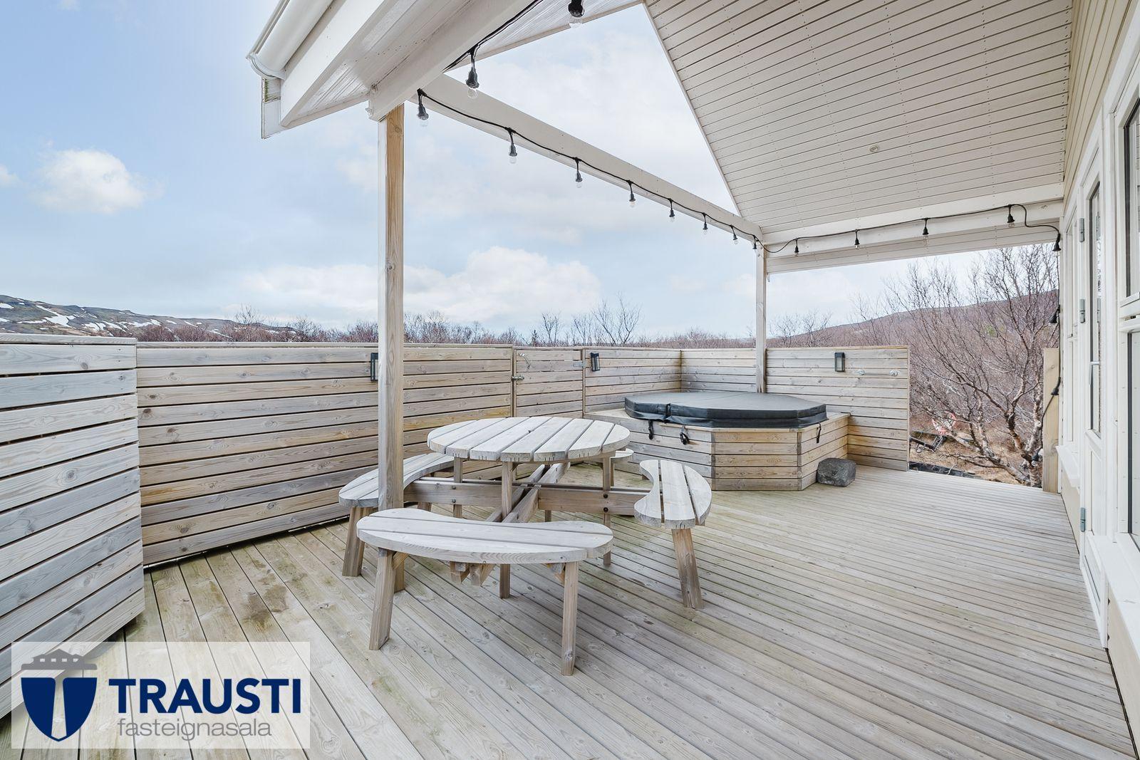 Verönd er á tvo vegu, vestur og suðurhlið hússins, heitur pottur og hægt að ganga á þrjá vegu niður á lóðina.