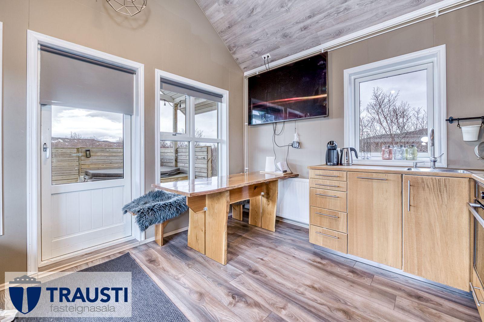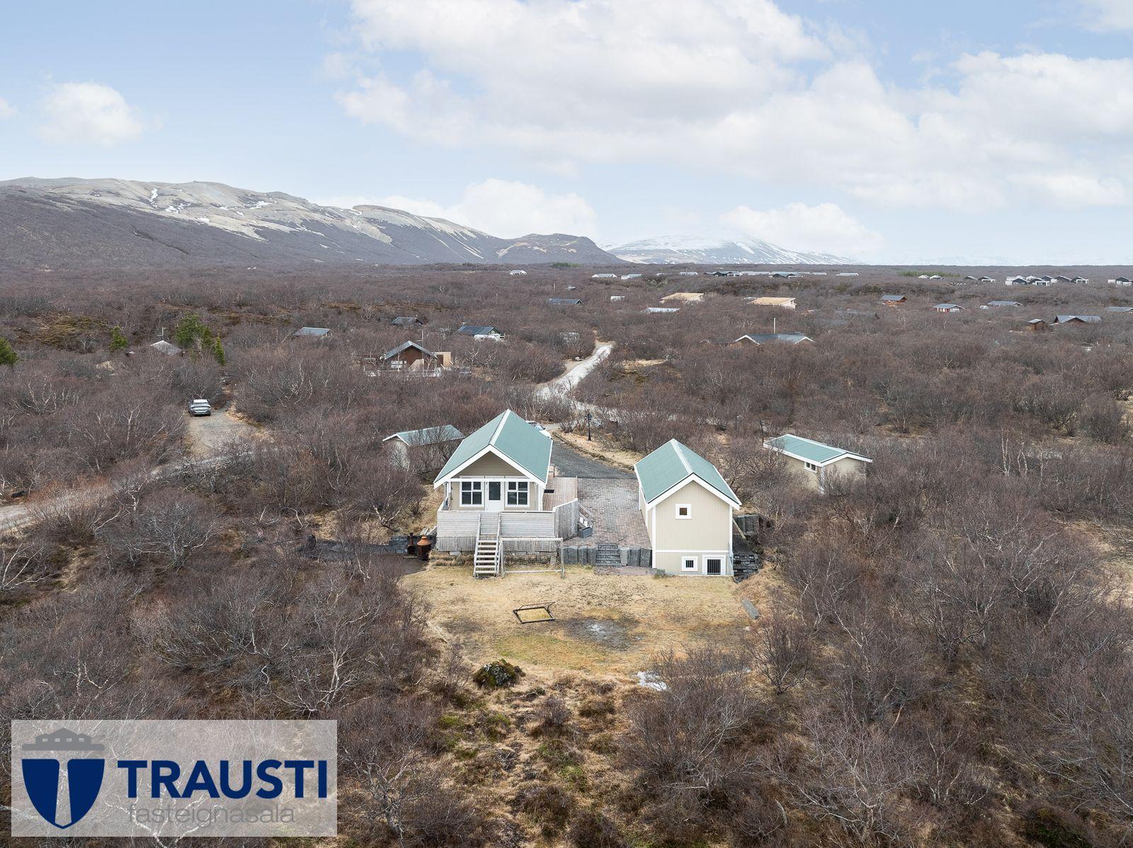 Um er að ræða einstaklega glæsilegt sumarhús byggt árið 2018 þar sem búið er að byggja upp frábæra aðstöðu fyrir stórfjölskyldu og/eða starfsmannafélög. Eignin samanstendur af aðalhúsi með svefnlofti, bílskúr með þvottahúsi, aukabaðherbergi, geymslulofti og jafnstórum kjallara með rúmlega fullri lofthæð undir öllum bílskúrnum.