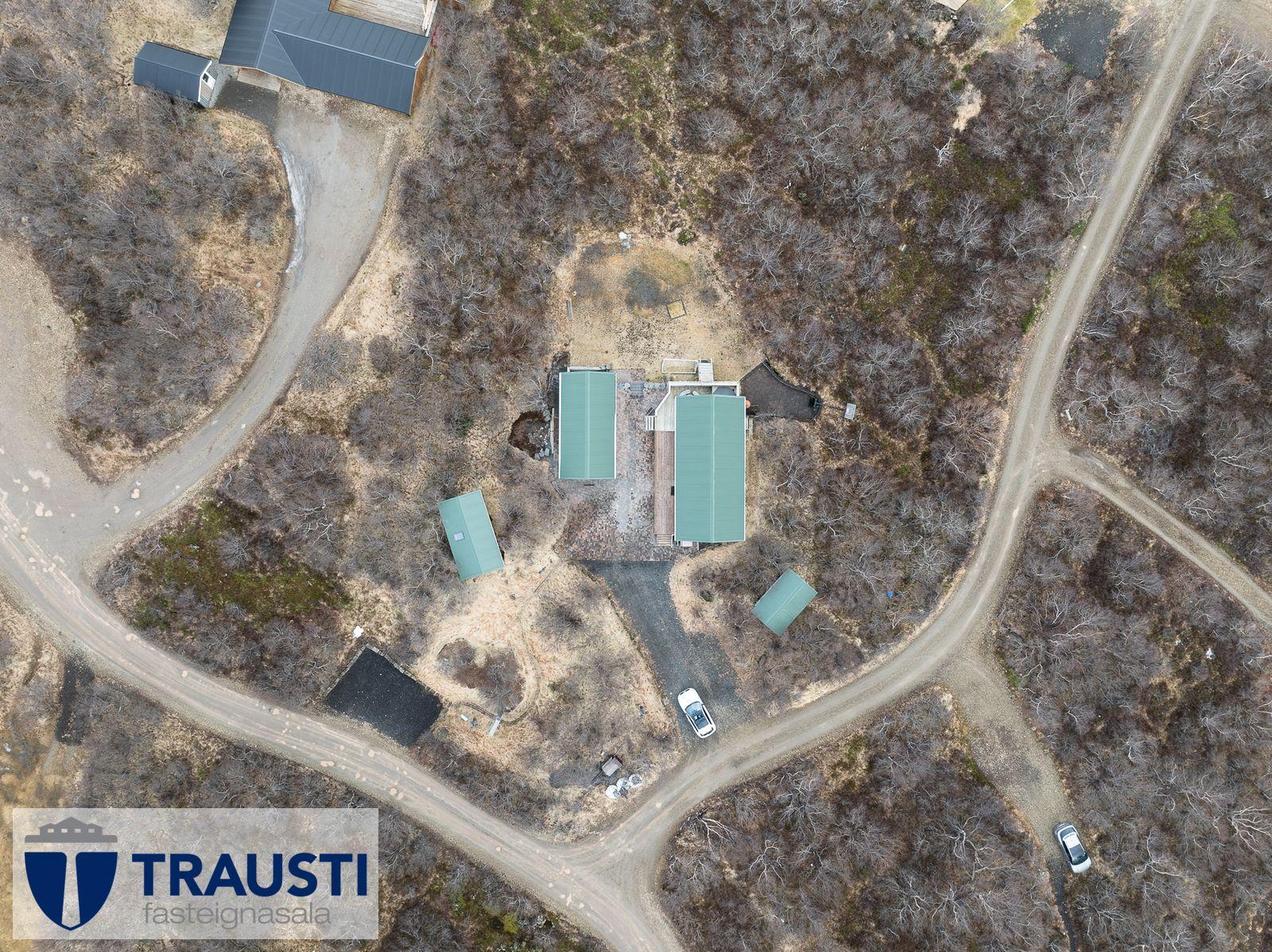 Einnig er stórt gestahús, grillhús, tveimur hellulögðum stórum bílastæðum, niðurgröfnu trampólíni, rúmgóðum sólpöllum með heitum potti, setusvæði í garði með útikamínu og góðum grasbletti, allt rammað inn með birkikjarri á mjög gróinni lóð. Lóðin er hlaðin á pöllum með stuðlabergi. Þetta er einstök eign með heildarfermetrafjölda nálægt 160 fm þótt birt stærð skv. Þjóðskrá Íslands sé ekki nema 45 fm.