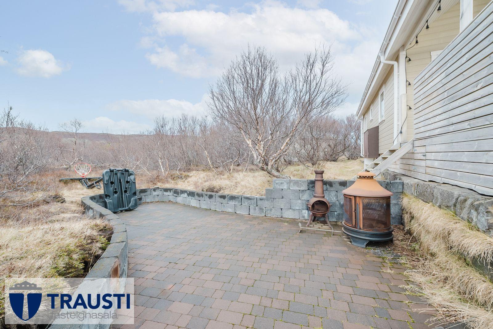 Lóðin er með fallega hlöðnu setusvæði með útikamínu, góðu grasbletti og fallega birkigrónu umhverfi.
