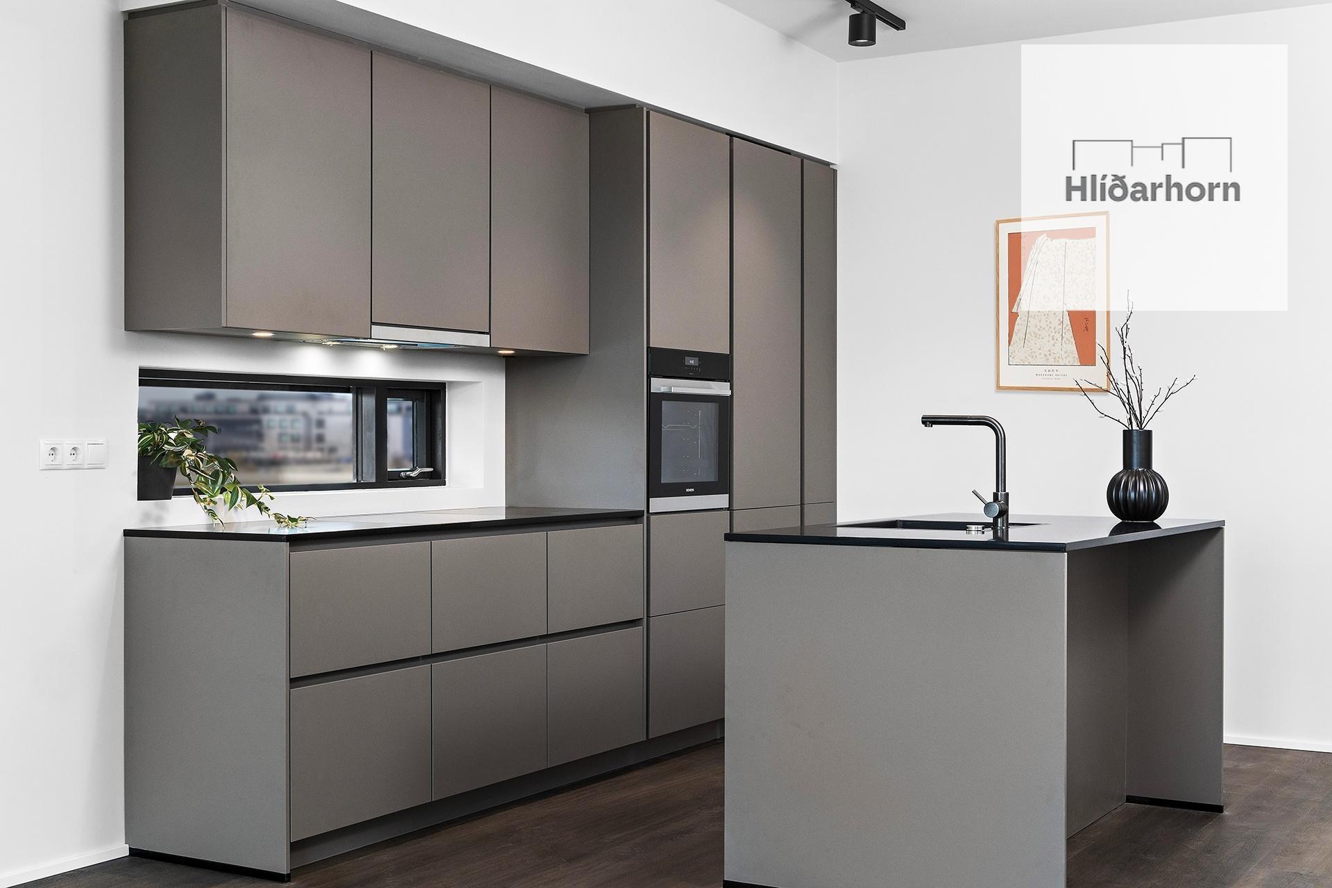 Nánari lýsing: Í anddyri eru góðir fataskápar. Gengið er úr anddyri beint inn í rúmgott alrými, eldhús með eyju, stofu/borðstofu með útgengi á rúmgóðar suðursvalir. Taupe grá eldhúsinnrétting, svartur quartz-steinn á borðum og milli skápa og vönduð ítölsk blöndunartæki úr byssubláu stáli. Innbyggður ísskápur. Rúmgott hjónaherbergi með góðum fataskápum. Baðherbergi með “walk-in” sturtu með hertu gleri, handklæðaofni og upphengdu salerni. Gráar steinflísar á gólfi og veggjum, taupe grá innrétting og speglaskápur með lýsingu. Blöndunartæki á baði úr byssubláu stáli. Afþiljuð aðstaða fyrir þvottavél og þurrkara. Sérgeymsla íbúðar í kjallara er merkt 0025. Í kjallara Hlíðarhorns eru sameiginlegar hjóla- og vagnageymslur og bílakjallari með fyrirkomulagi samnýtingar þar sem íbúar munu hafa forgang.