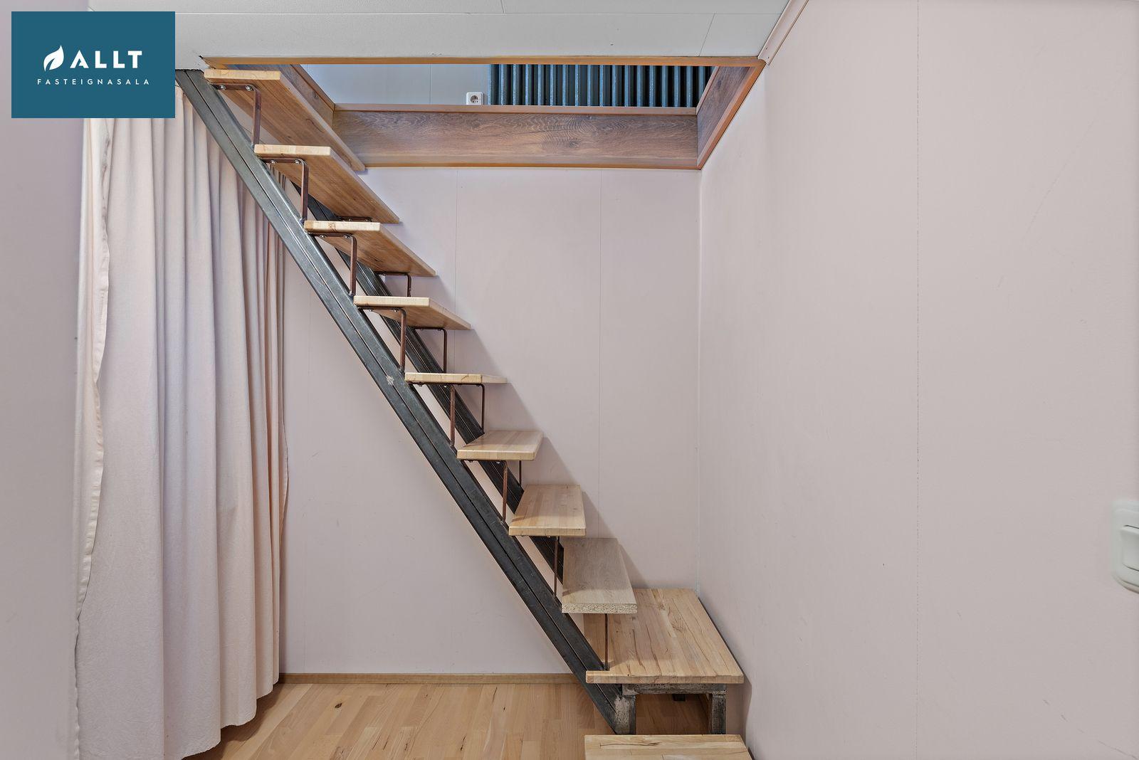 Stigi: Teppalagður stigi upp á efri hæð.